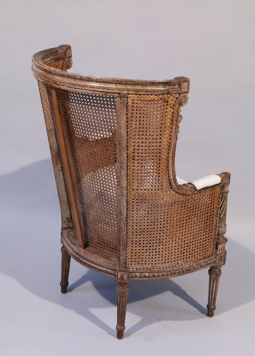 BERGERE en CONFESSIONAL en bois naturel richement mouluré et sculpté d'un décor néoclassique tels que lauriers rubanés, grattoirs et guirlandes de fleurs. Consoles d'accotoirs en colonnes détachées à base feuillagée et cannelures torses à rangs de perles, dés de raccordements à fleurons. Repose sur quatre pieds droits cannelés. Fond et joues cannés, garniture de cuir blanc.