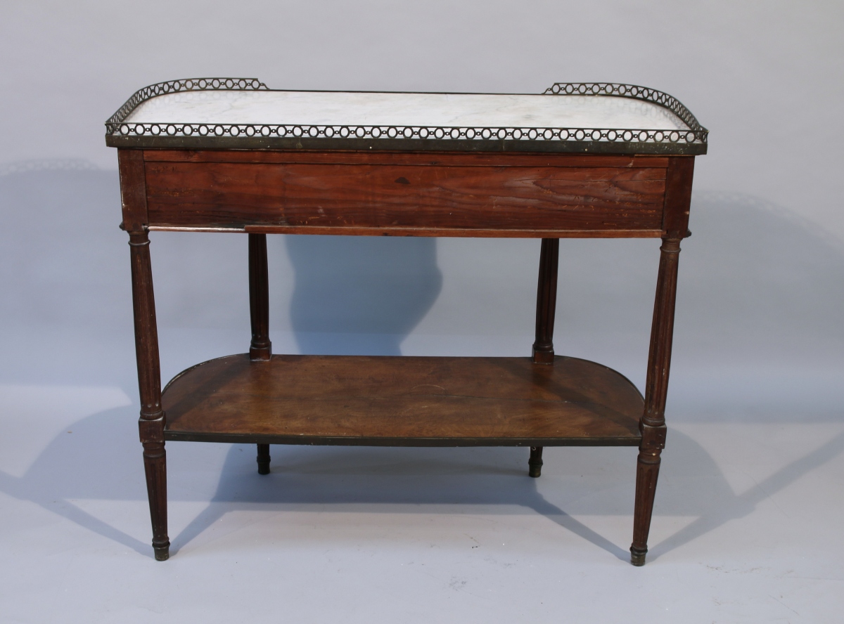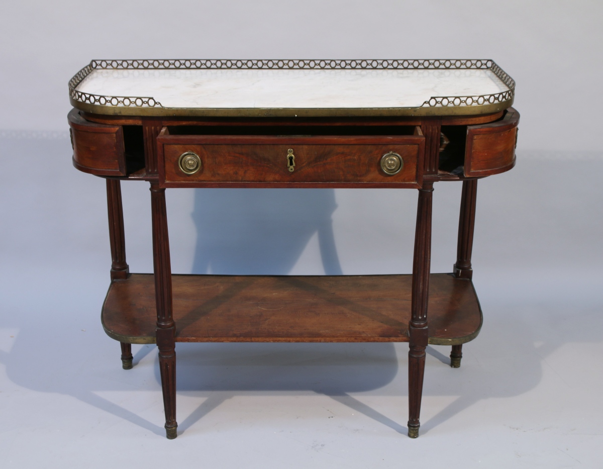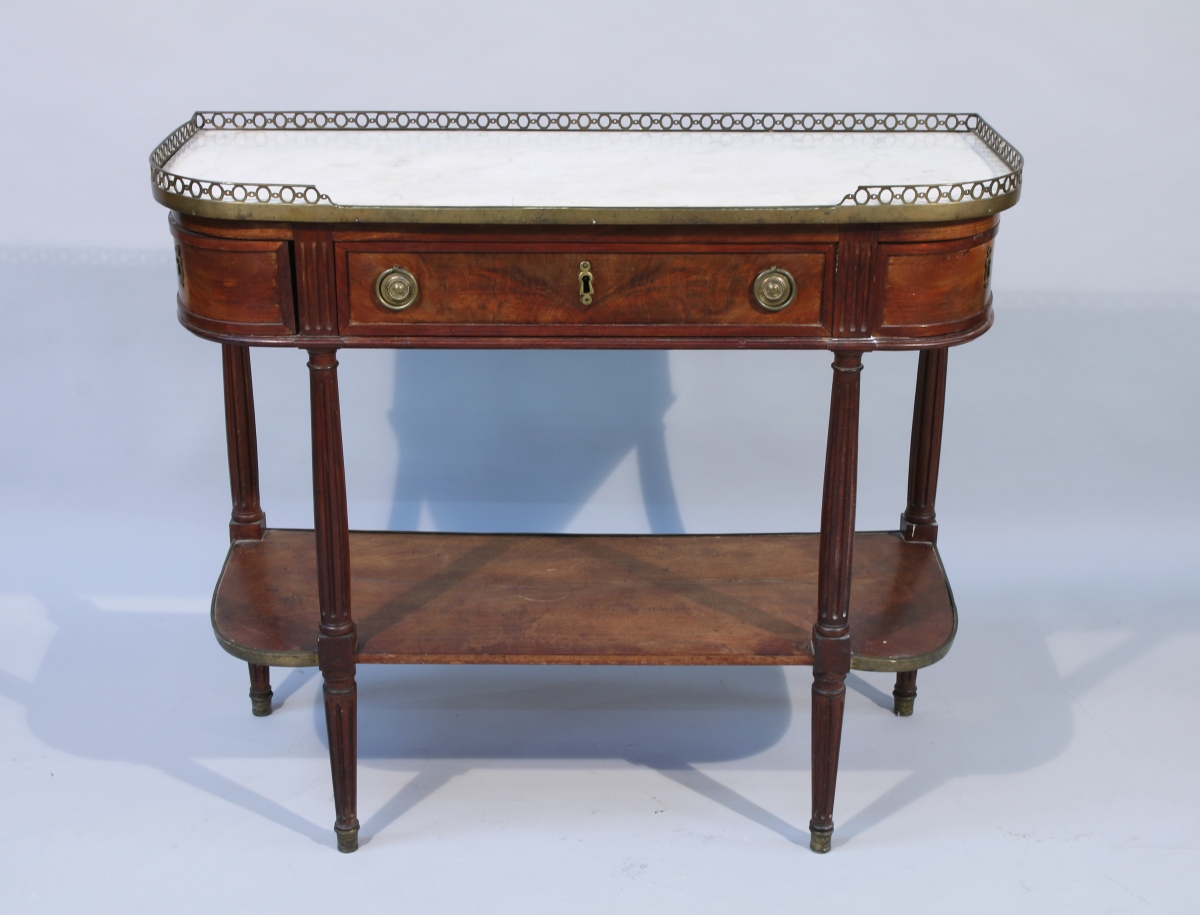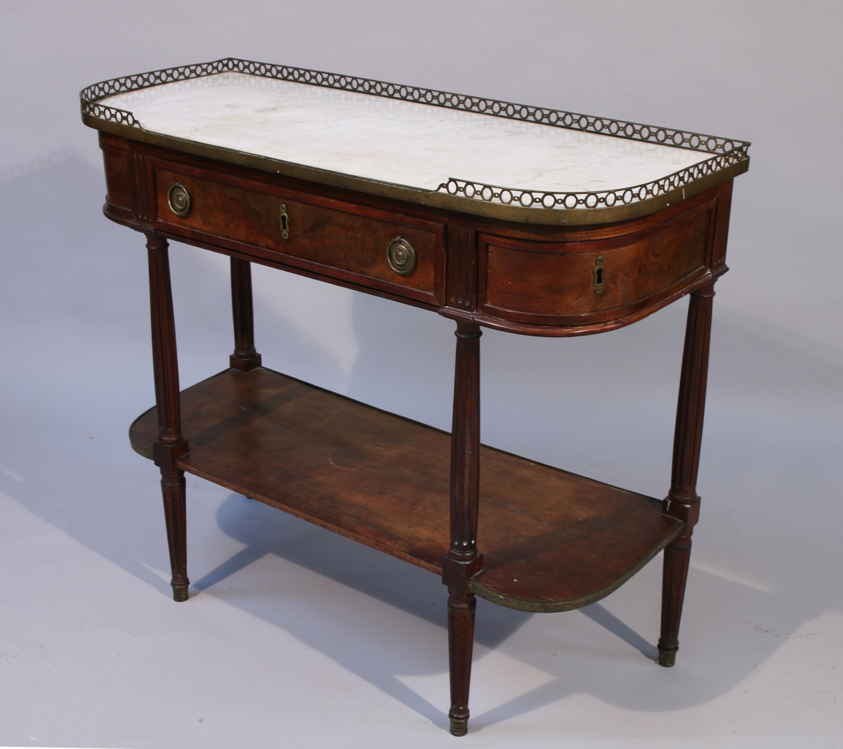 DESSERTE de forme oblongue en acajou et placage d'acajou. Elle ouvre par trois tiroirs en ceinture dont deux dans les arrondis. Elle repose sur quatre pieds fuselés et cannelés réunis par une tablette d'entretoise. Ornementation de laiton tels qu'anneaux de tirage, entrées de serrures et sabots. Le plateau foncé d'un marbre blanc (accidenté) ceint d'une galerie de laiton ajourée.