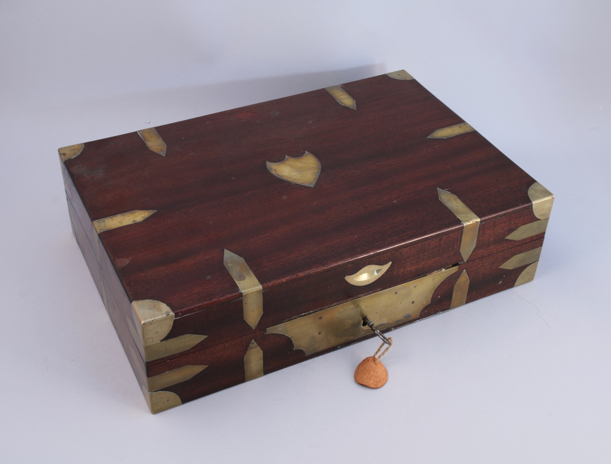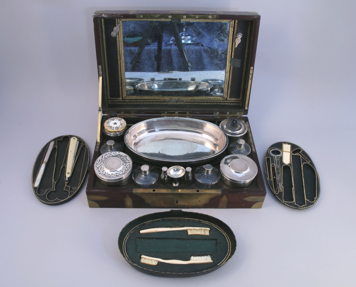 COFFRET de forme rectangulaire en placage d'acajou à garnitures de laiton incrusté en son centre d'un écu vierge. L'intérieur gainé de maroquin vert doré au petit fer de frises florales et géométriques. Il accueille un ensemble de 21 éléments en argent, cristal, porcelaine, verre, acier, dont boîtes, flacons, ustensiles de toilette, verseuse, bassin, gobelet, verre, miroir (manque un certain nombre d'éléments).