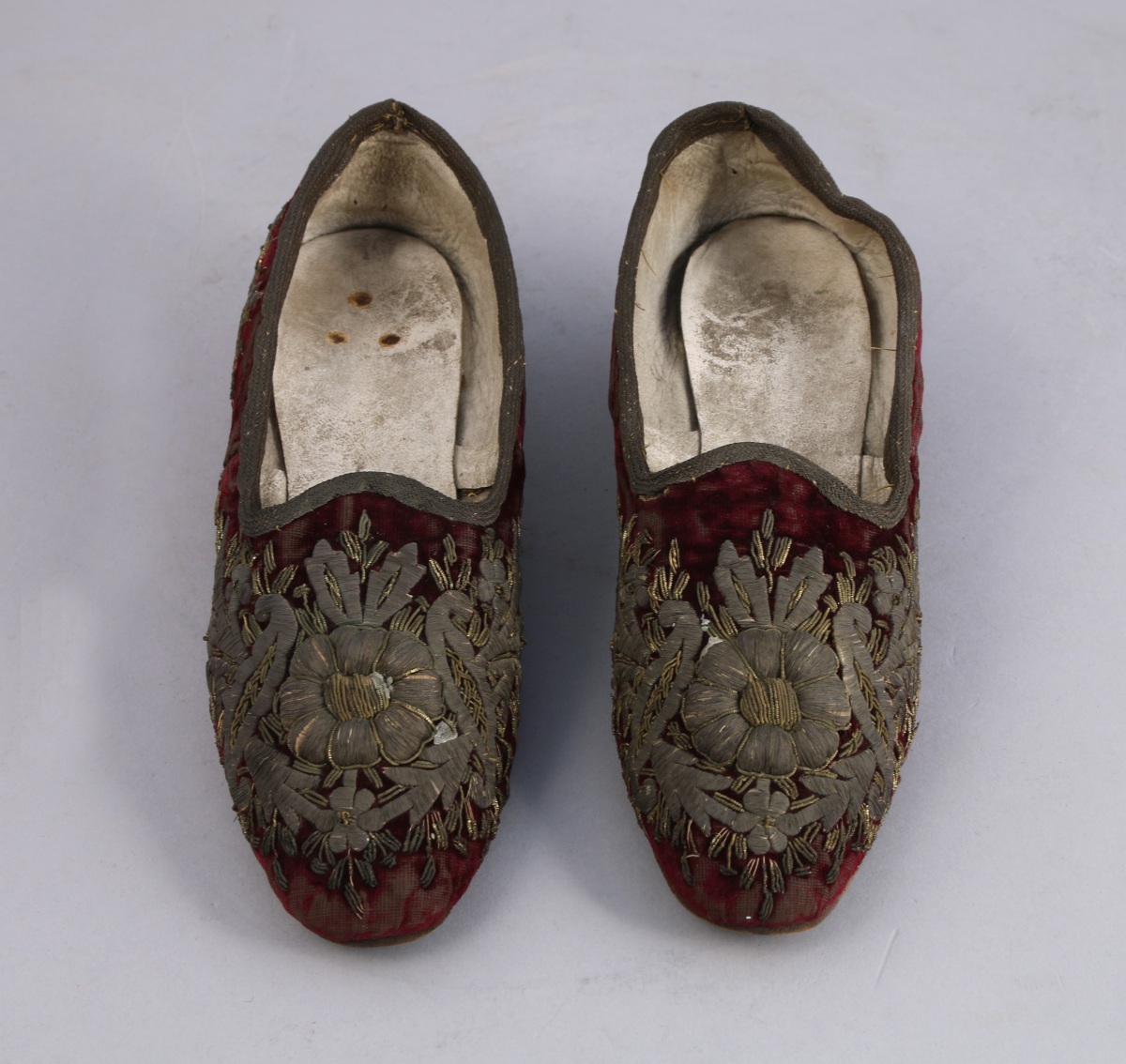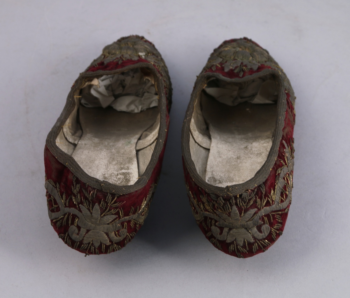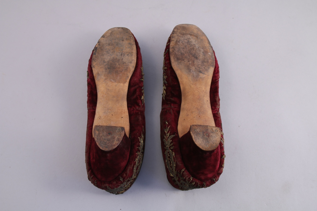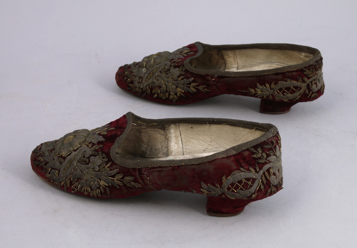 PAIRE de SOULIERS de dame en velours bordeaux richement brodés au fil d'or et d'argent de motifs floraux. Petit talon.