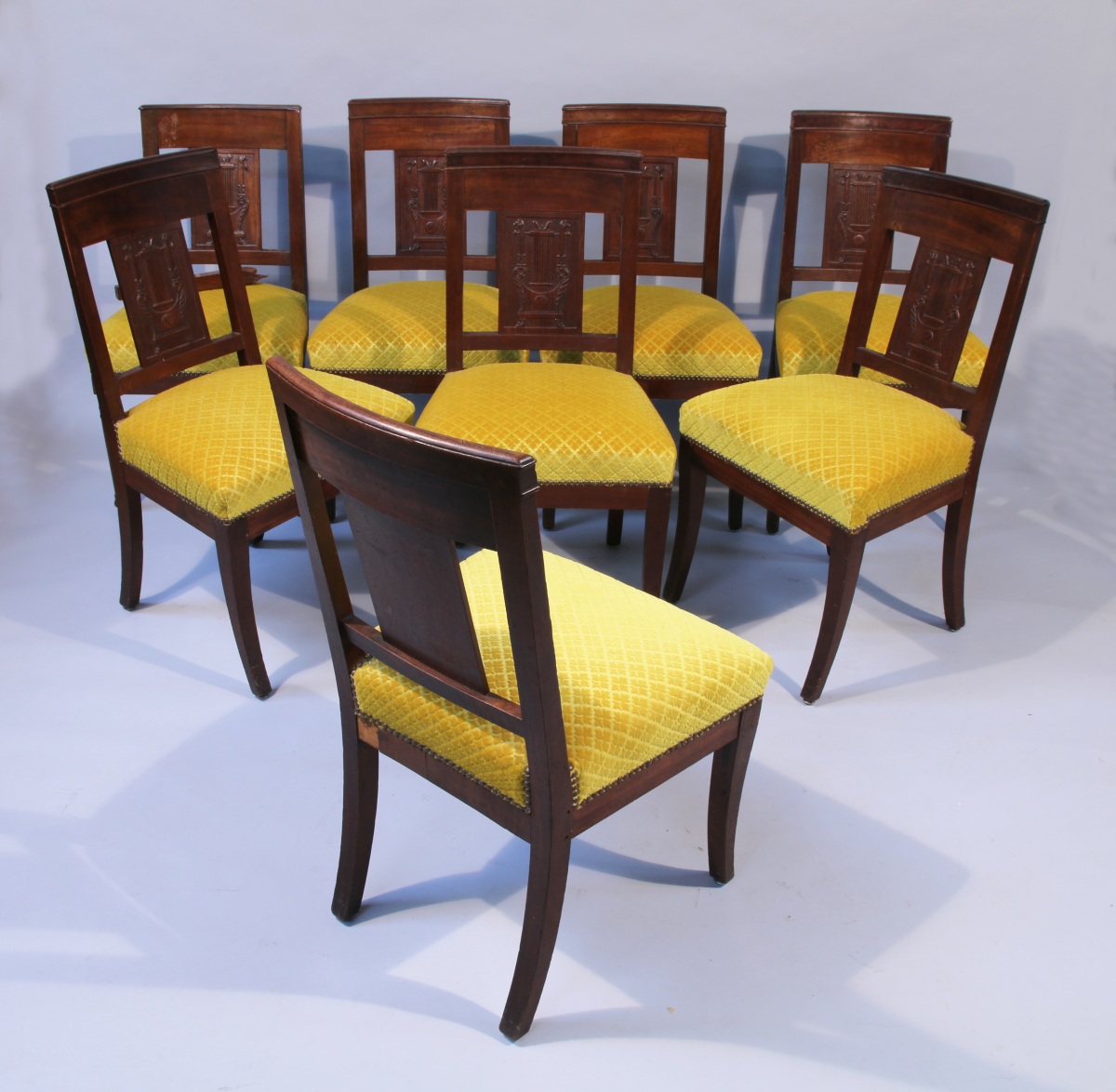 Belle SUITE de 8 CHAISES de SALLE à MANGER en acajou et placage d'acajou, dossier droit à bandeau orné d'une lyre. Les pieds antérieurs en balustre, pieds postérieurs en sabre. Garniture de velours jaune.
