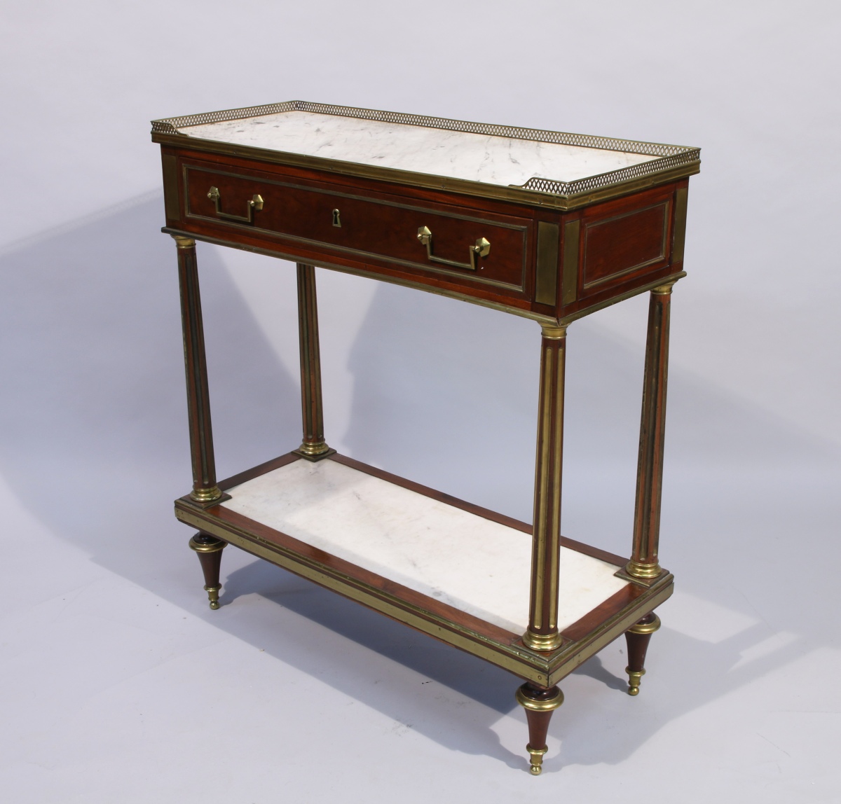 DESSERTE de forme rectangulaire en acajou et placage d'acajou ouvrant par un tiroir en ceinture. Le plateau supérieur en marbre blanc est surmonté d'une galerie en laiton ajourée de croisillons. Il est supporté par quatre piliers de section ronde fuselés et cannelés réunis par un plateau d'entretoise en marbre blanc. Piètement quadripode en toupie. Garniture en laiton telle que lingotière, entrée de serrure, poignées mobiles, chapiteaux et bases des piliers, et bouts de pied.