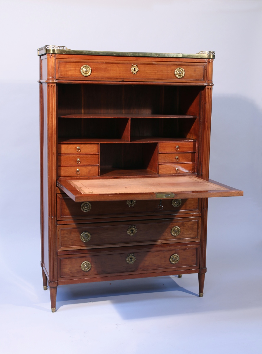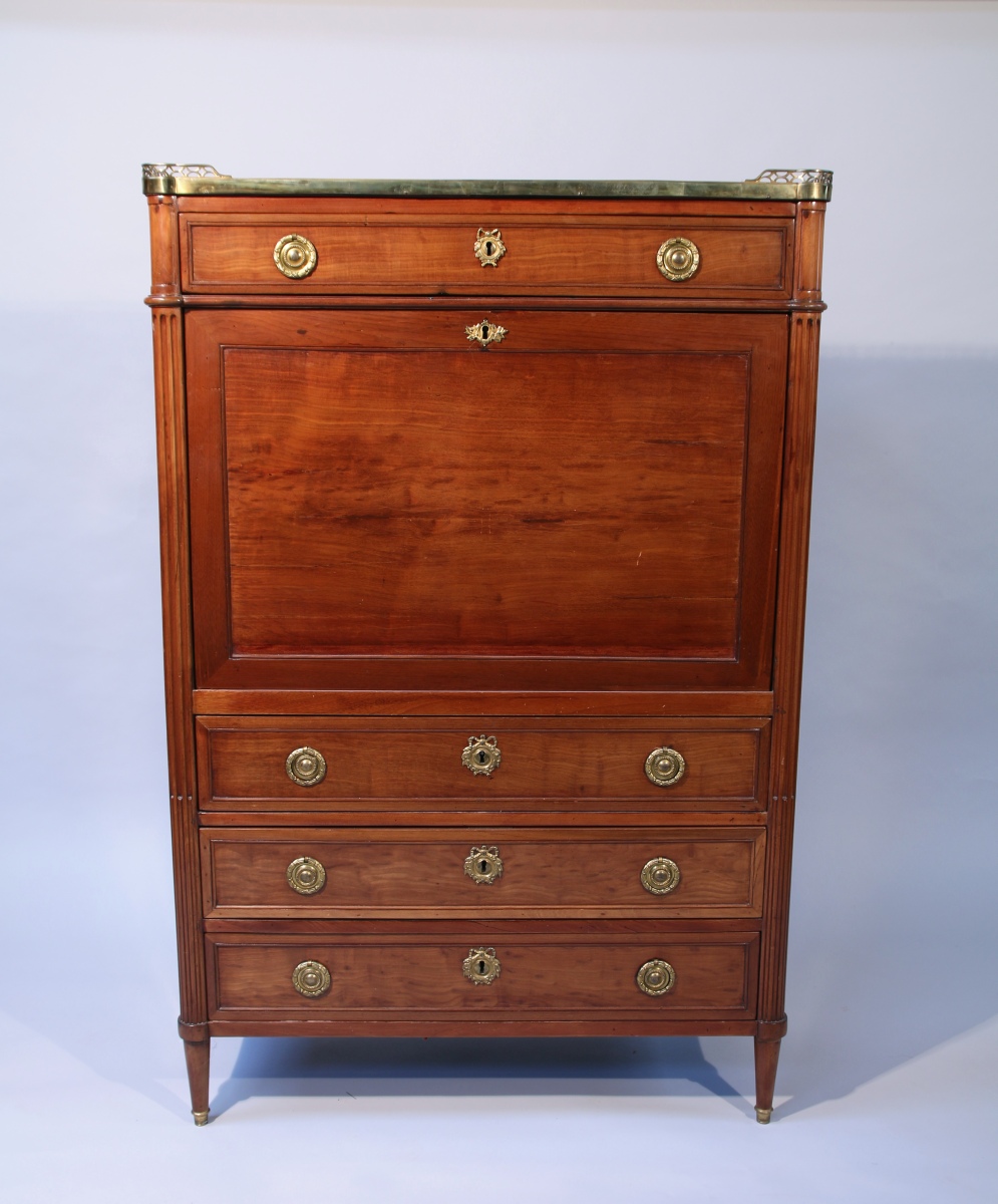 SECRÉTAIRE DROIT en acajou et placage d'acajou. Il ouvre par un tiroir et un abattant en partie supérieure et par trois tiroirs en partie inférieure. Le plateau de marbre blanc est surmonté d'une galerie ajourée en bronze doré à décor d'entrelacs. L'abattant foncé de cuir découvre quatre compartiments et six tiroirs sur trois rangs. Le secrétaire est encadré deux montants antérieurs cannelés rudentés et deux montants postérieurs de section carrée cannelés. Piètement quadripode de section ronde et fuselé. Garniture de bronzes dorés de style néoclassique tels qu'entrées de serrures, poignées mobiles et sabots.