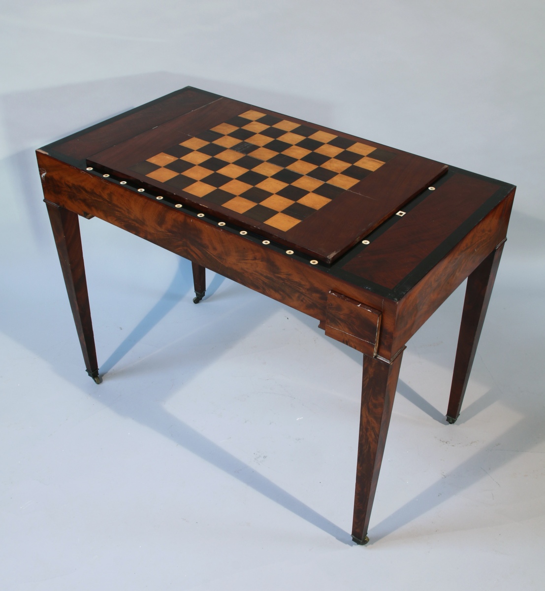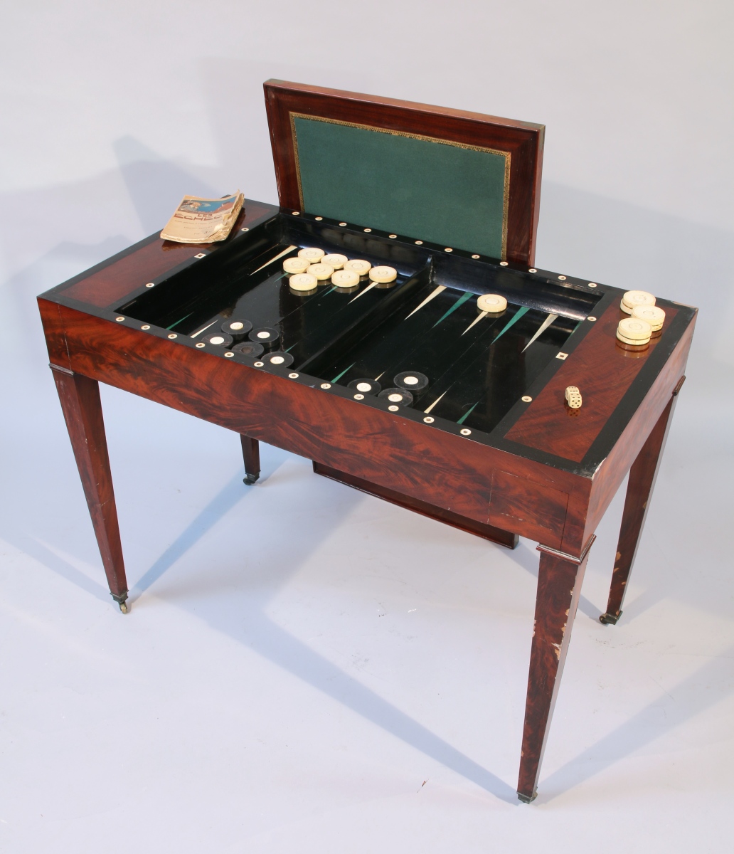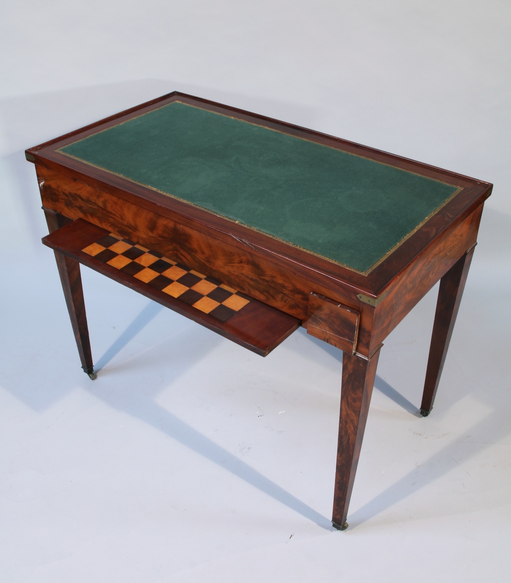 TABLE TRIC-TRAC en acajou et placage d'acajou flammé ouvrant par deux tiroirs. Le plateau gainé d'un cuir doré aux petits-fers pour une face et d'un feutre (postérieur) pour l'autre. Il découvre un intérieur en placage d'ébène incrusté d'os et d'os teinté vert. La ceinture recèle un plateau à double damier. Il repose sur quatre pieds gaine terminés par des sabots de bronze à roulettes.