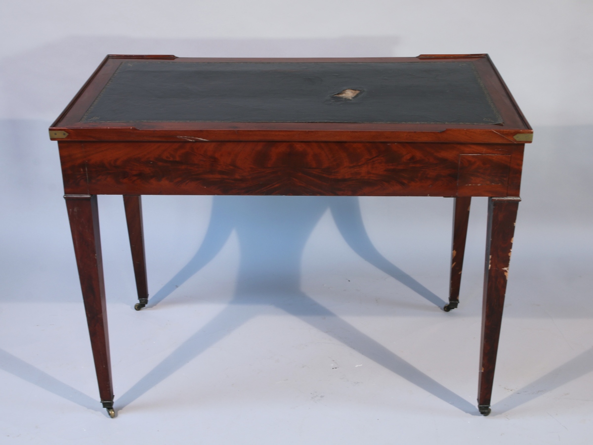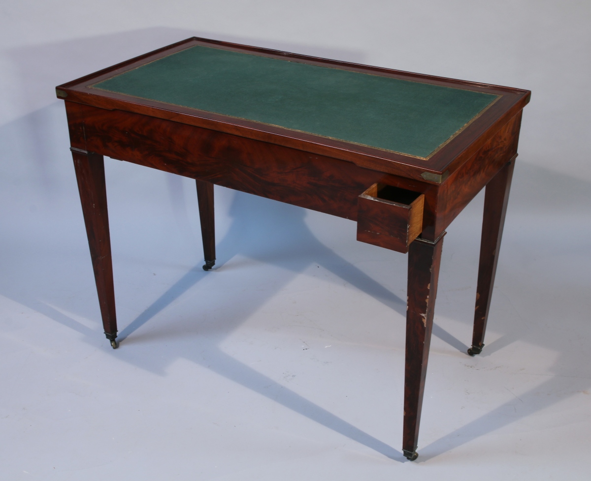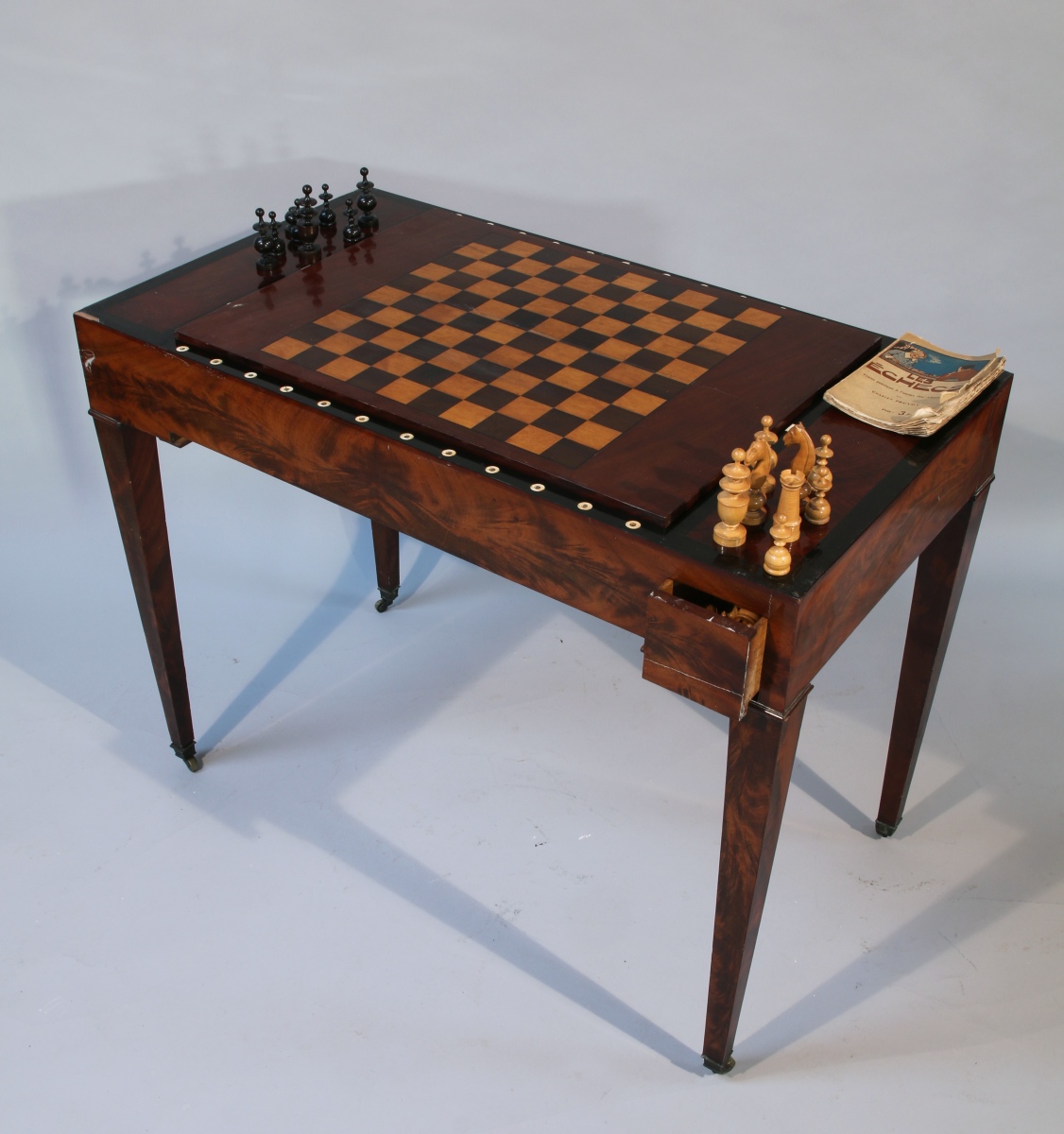 TABLE TRIC-TRAC en acajou et placage d'acajou flammé ouvrant par deux tiroirs. Le plateau gainé d'un cuir doré aux petits-fers pour une face et d'un feutre (postérieur) pour l'autre. Il découvre un intérieur en placage d'ébène incrusté d'os et d'os teinté vert. La ceinture recèle un plateau à double damier. Il repose sur quatre pieds gaine terminés par des sabots de bronze à roulettes.