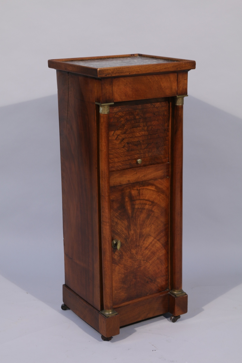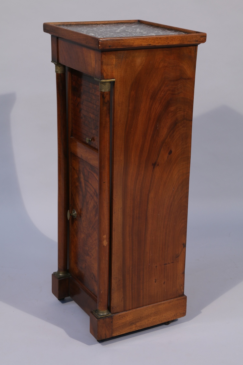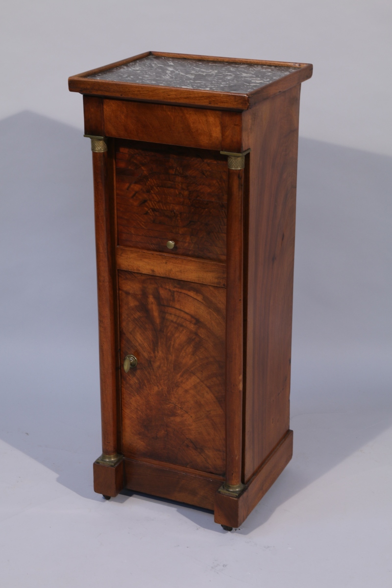 CHEVET de forme rectangulaire en acajou et placage d'acajou. La façade à colonnes détachées à chapiteaux et bases de bronze, ouvre à un volet à lattes et un vantail. Le piètement en plinthe repose sur quatre roulettes. Il est coiffé d'un marbre Saint-Anne.