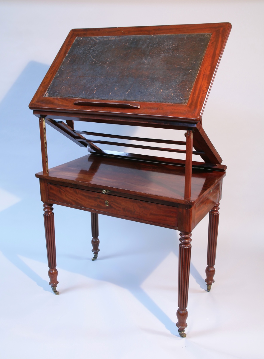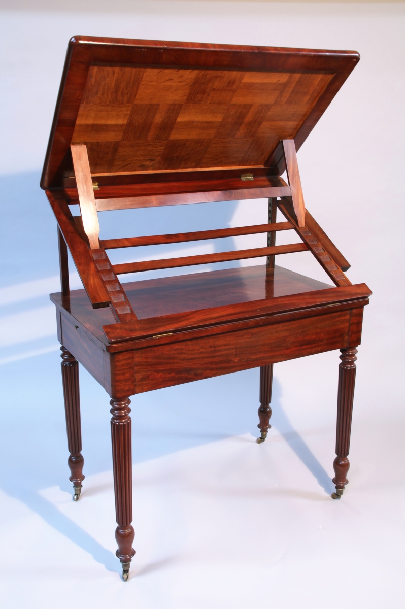 TABLE à LA TRONCHIN de forme rectangulaire en acajou et placage d'acajou à ramages. Elle présente un plateau inclinable à double évolution, tendu d'un cuir à décor de petits fers. La table ouvrant à deux tirettes latérales et un tiroir en façade découvre une écritoire coulissant foncé d'un cuir aubergine à décor de petits fers accompagné d'un plumier et deux godets. Elle repose sur quatre pieds godronnés à roulettes