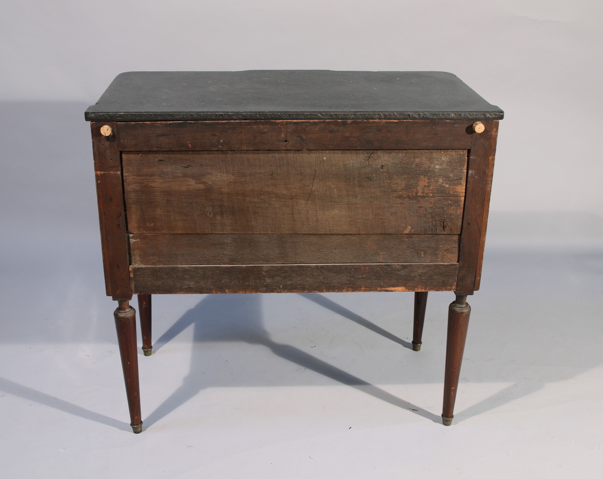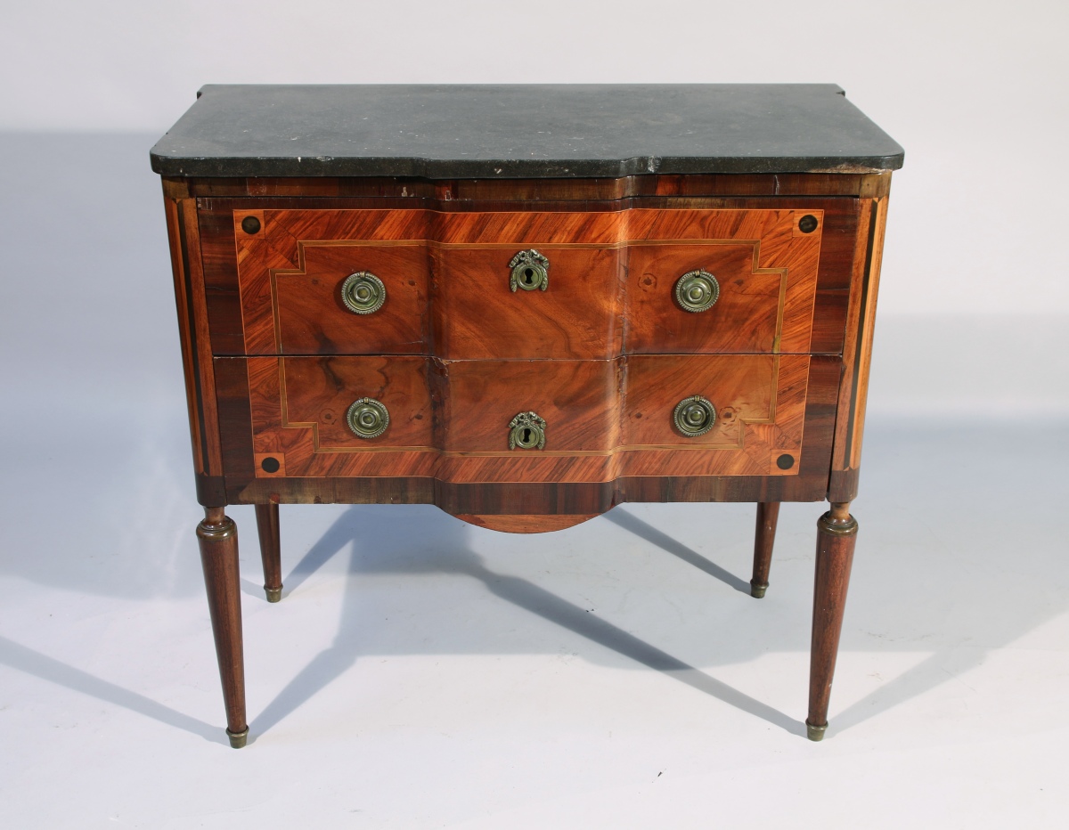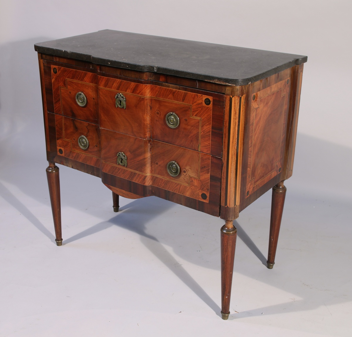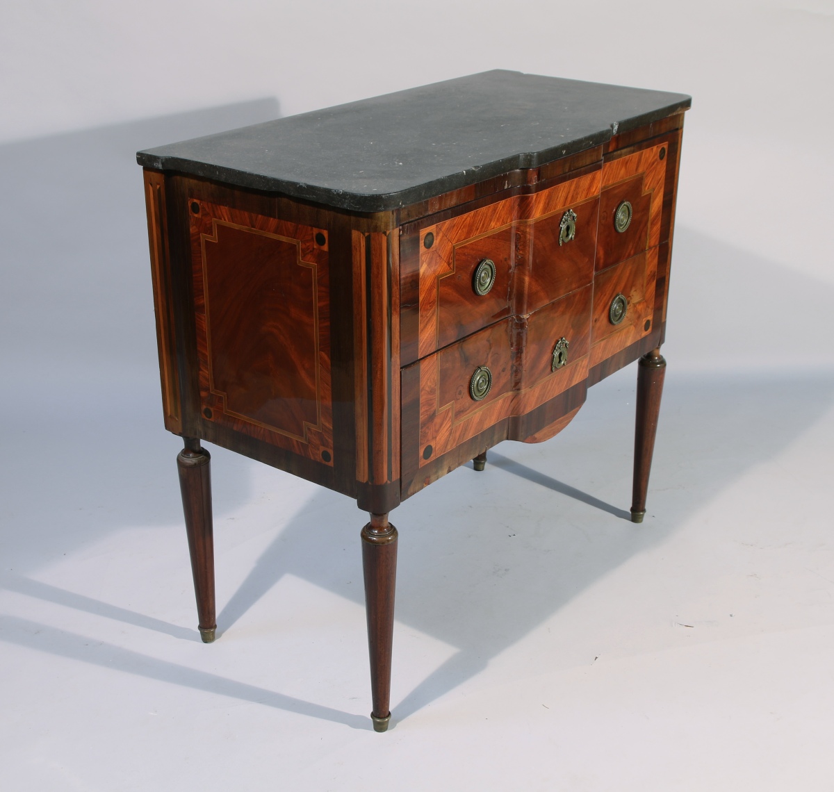 Petite COMMODE SAUTEUSE de forme rectangulaire à ressaut central, en placage d'acajou, bois de violette, amarante et bois teinté à décor de marqueterie de filets et motifs géométriques. Elle ouvre à deux tiroirs sans traverse en façade. Les montants arrondis en cannelures simulées, terminés par quatre pieds fuselés. Ornementation de bronzes ciselés tels qu'entrées de serrure, anneaux de tirage et sabots.