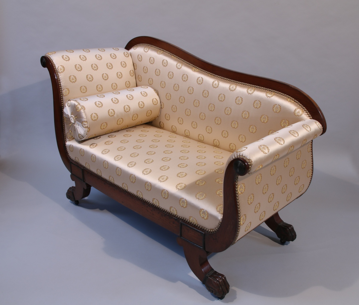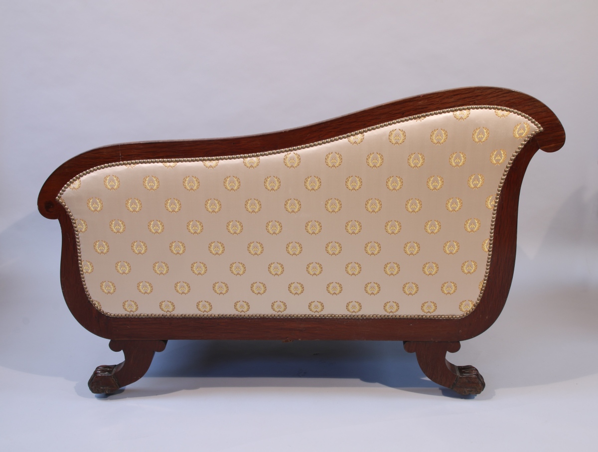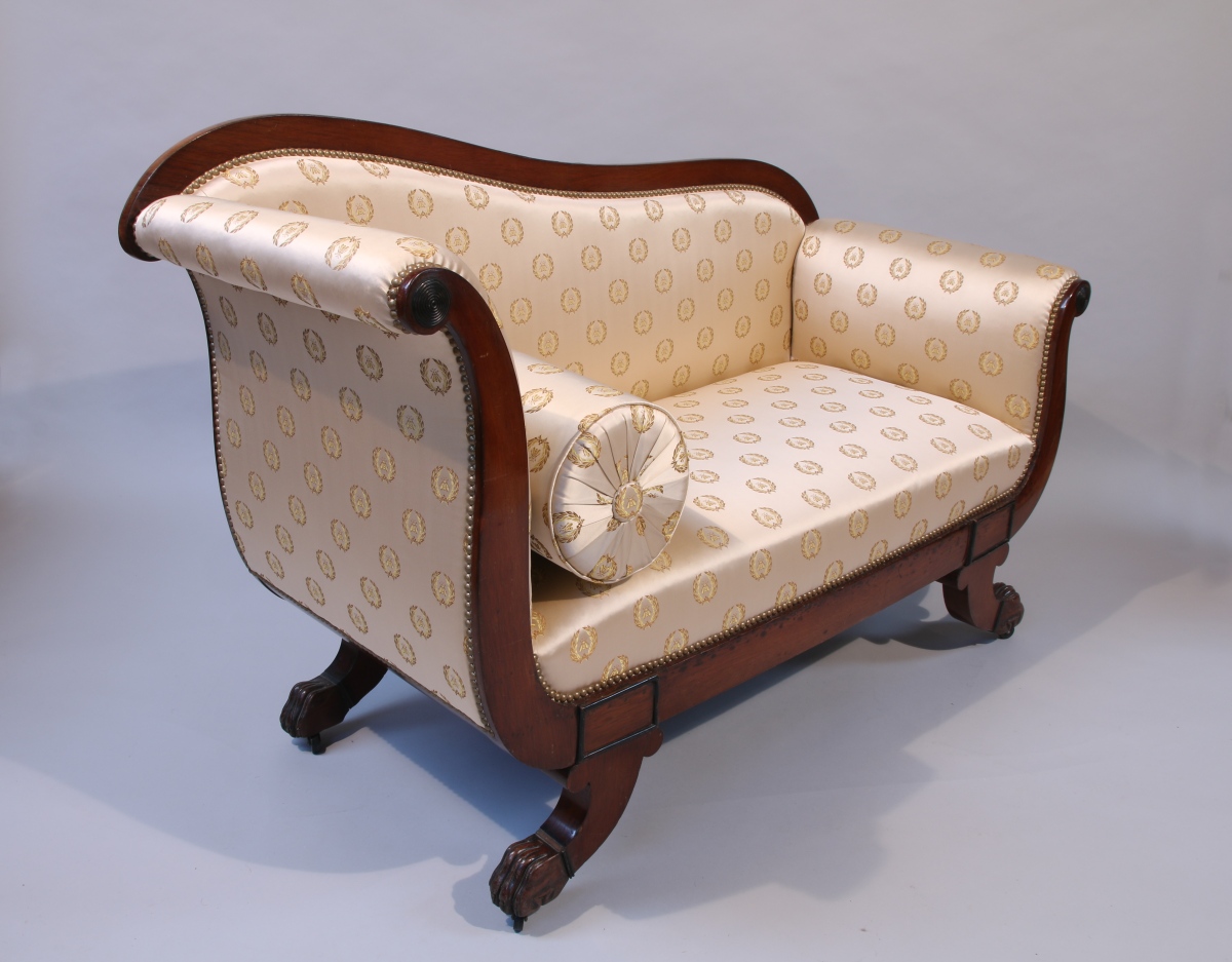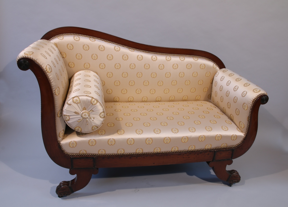 MÉRIDIENNE à CHEVETS RENVERSÉS et dossier mouvementé en acajou et placage d'acajou à décor de spirales et cartouches en bois noirci. Elle repose sur quatre pieds griffes à roulettes.