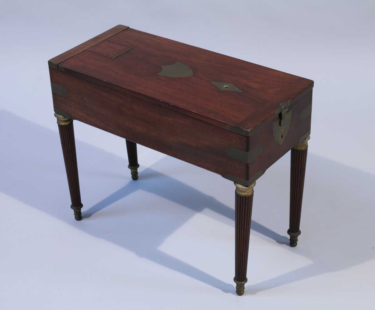 Rare BIDET de VOYAGE d'officier, démontable, par BIENNAIS, en acajou, garnitures et écu; le couvercle est démontable et se retourne pour certaines utilisations, il est muni d'un coussinet en maroquin entouré d'un cloutage de laiton et se ferme à l'aide d'une clef. Les quatre pieds ronds en acajou, cannelés, ornés de sabots et de viroles en laiton guilloché et doré, sont dévissables pour le transport.