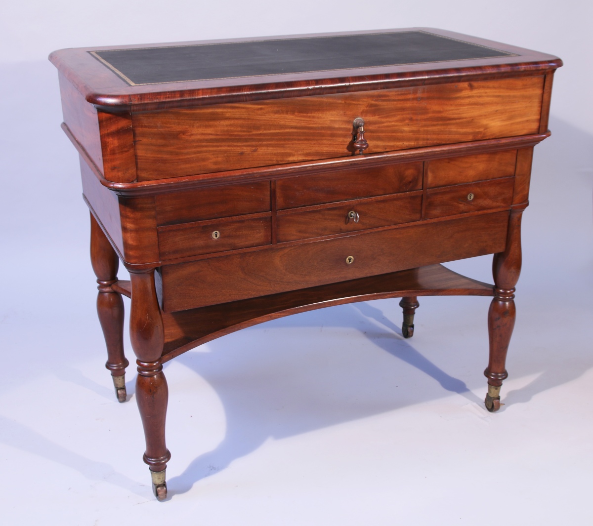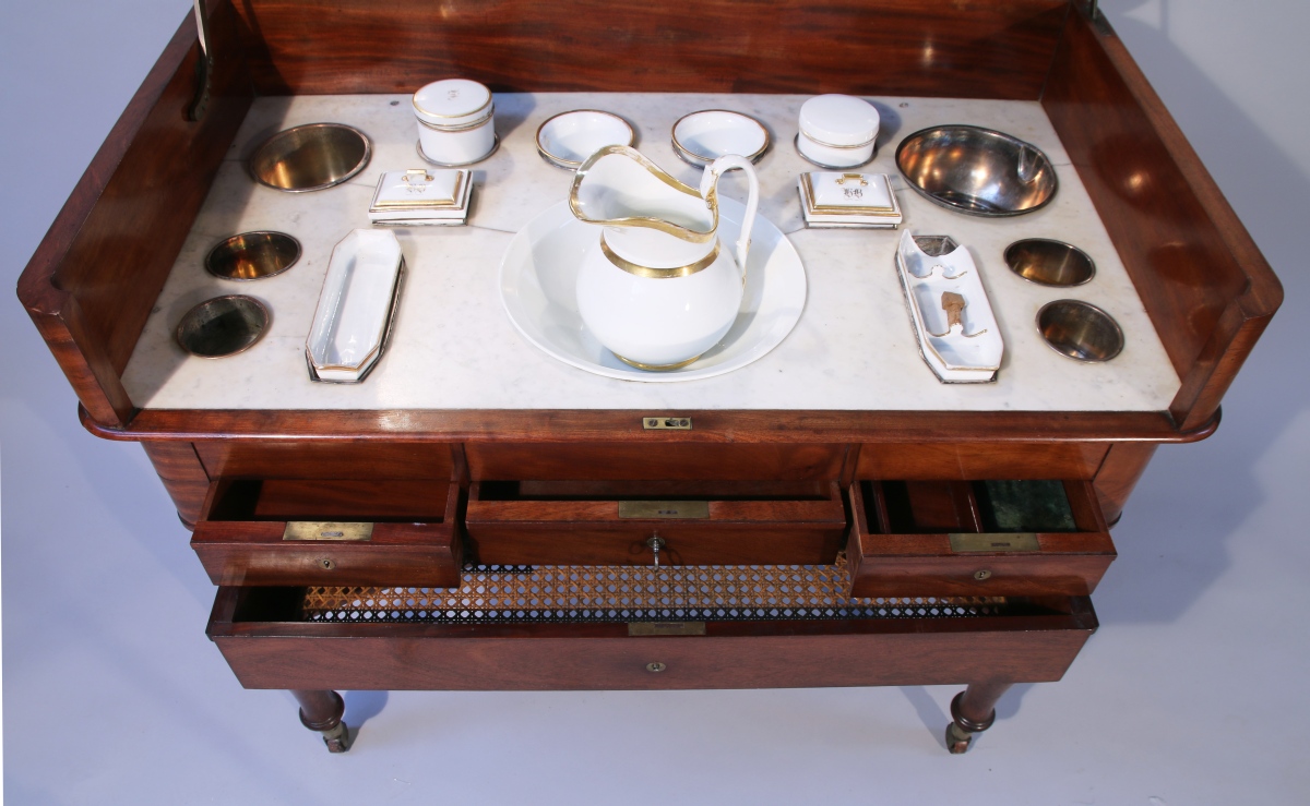 TABLE de TOILETTE de forme rectangulaire en acajou et placage d'acajou. Elle ouvre à quatre tiroirs en façade, l'un à fond canné. Le plateau tendu d'un cuir vert à décor aux petits fers, découvre un miroir et un intérieur compartimenté en marbre blanc veiné. Complète de ses accessoires en métal argenté et porcelaine, certains monogrammés et portant la marque "F.Touchard 12 rue de la michaudière" (accidents). La table repose sur quatre pieds balustres à roulettes réunis par une entretoise.