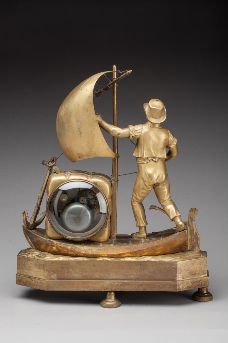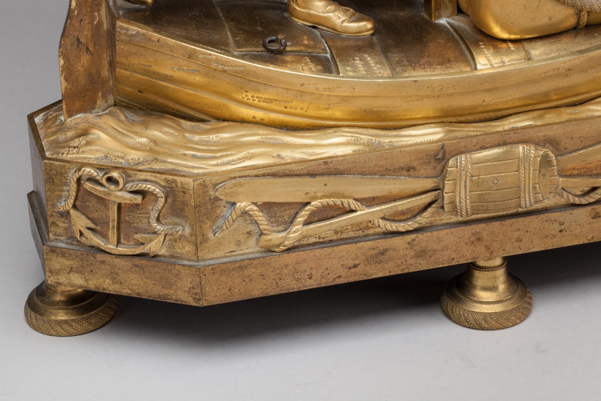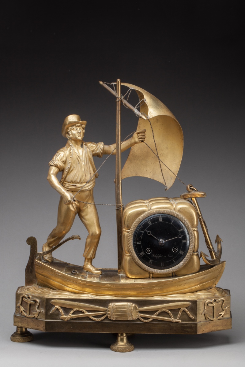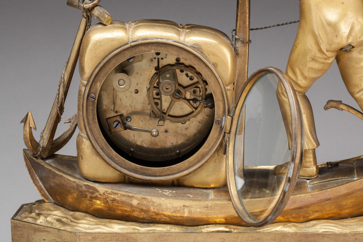 PENDULE au MARIN en bronze ciselé et doré figurant un marin hissant les voiles, debout dans son navire. Cadran en métal argenté - argent (?) gravé "Delafosse à Paris" inscrit dans un ballot de marchandises sur lequel s'appuie une ancre. Il indique les heures en chiffres romains. Base oblongue à pans appliquée d'un trophée de rames, bouts et tonneau flanqués d'une ancre. Piètement quadripode.