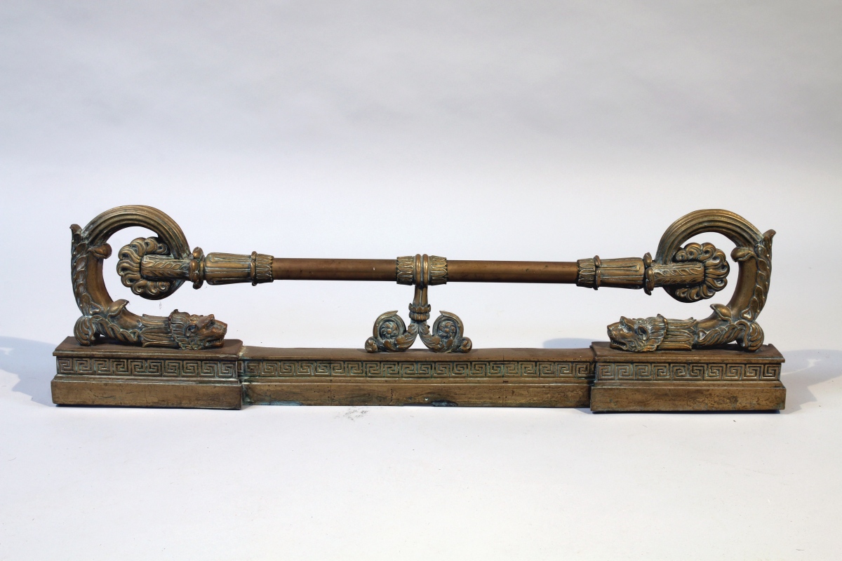 BARRE DE FOYER en bronze à décor d'une frise de grecques flanquée de deux têtes de lion à large enroulement feuillagé. Traces de dorure.