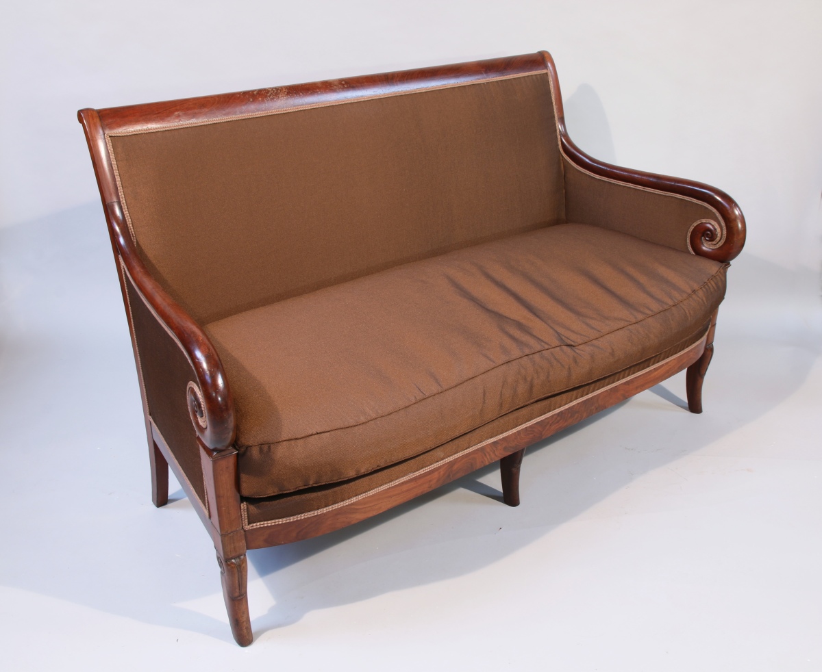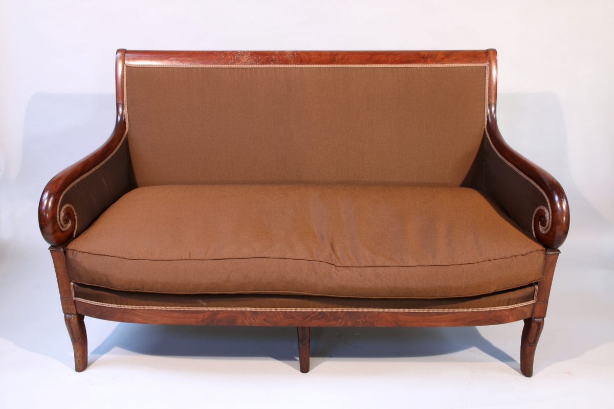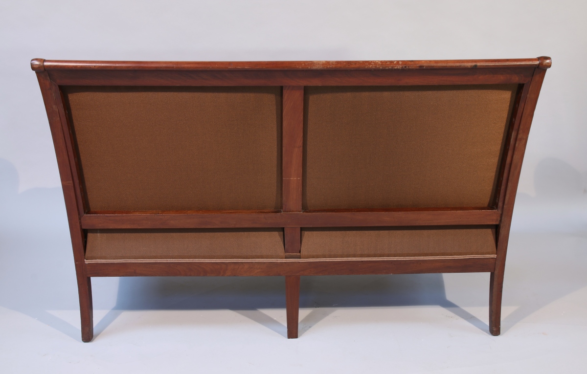 BANQUETTE en acajou sculpté, le dossier renversé et les accotoirs à enroulements. Elle repose sur six pieds, les antérieurs en jarret stylisés, les postérieurs en sabre.