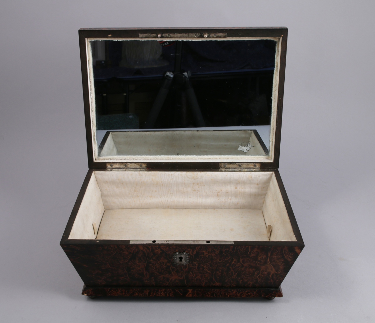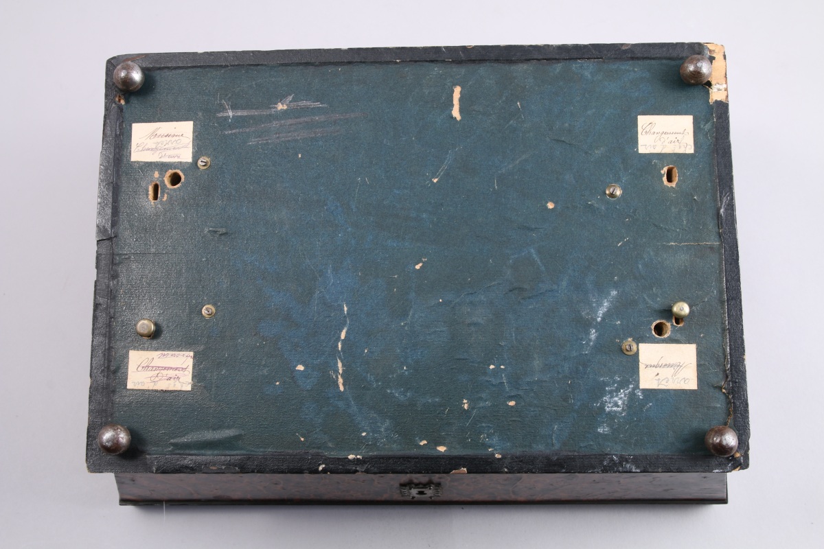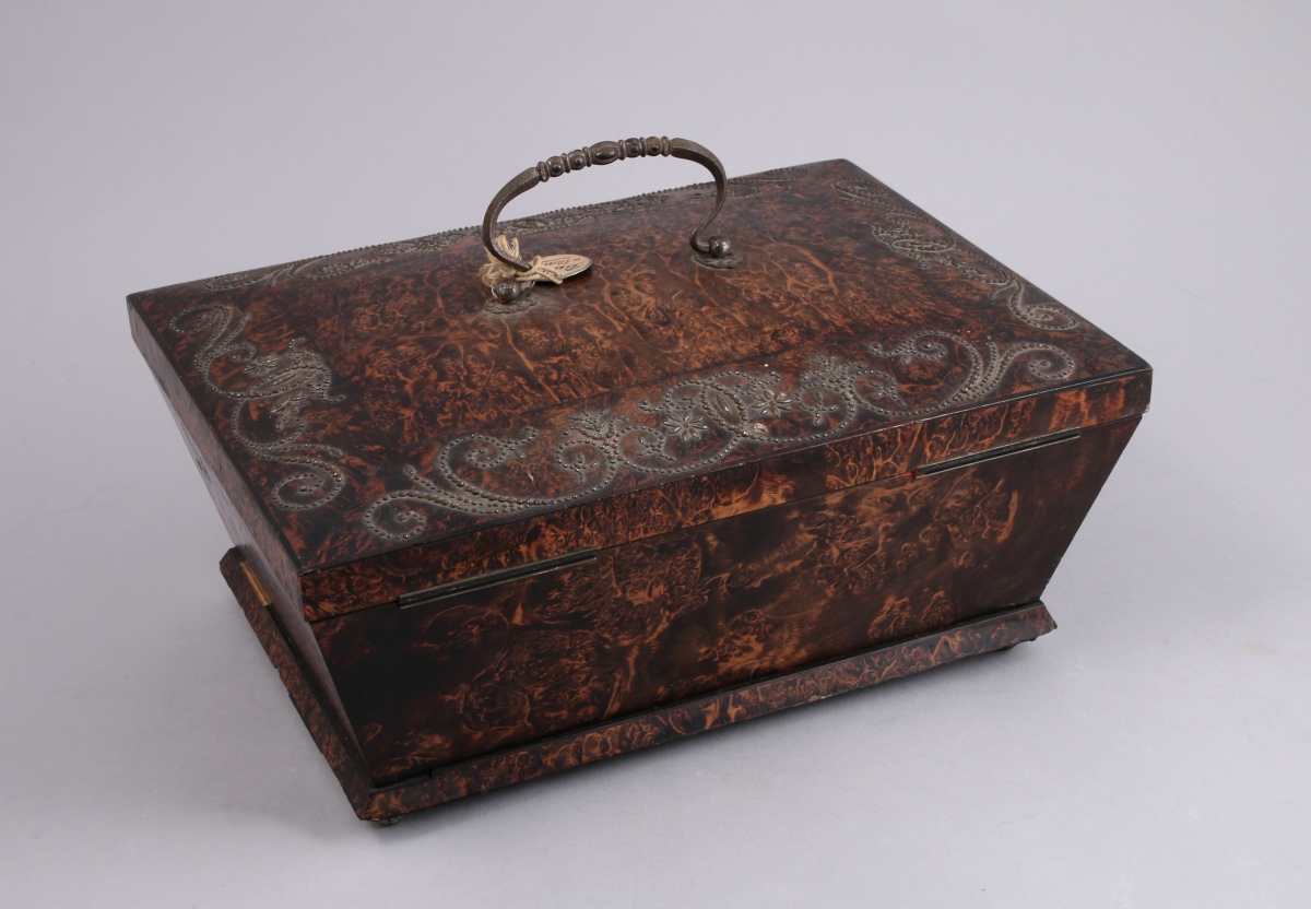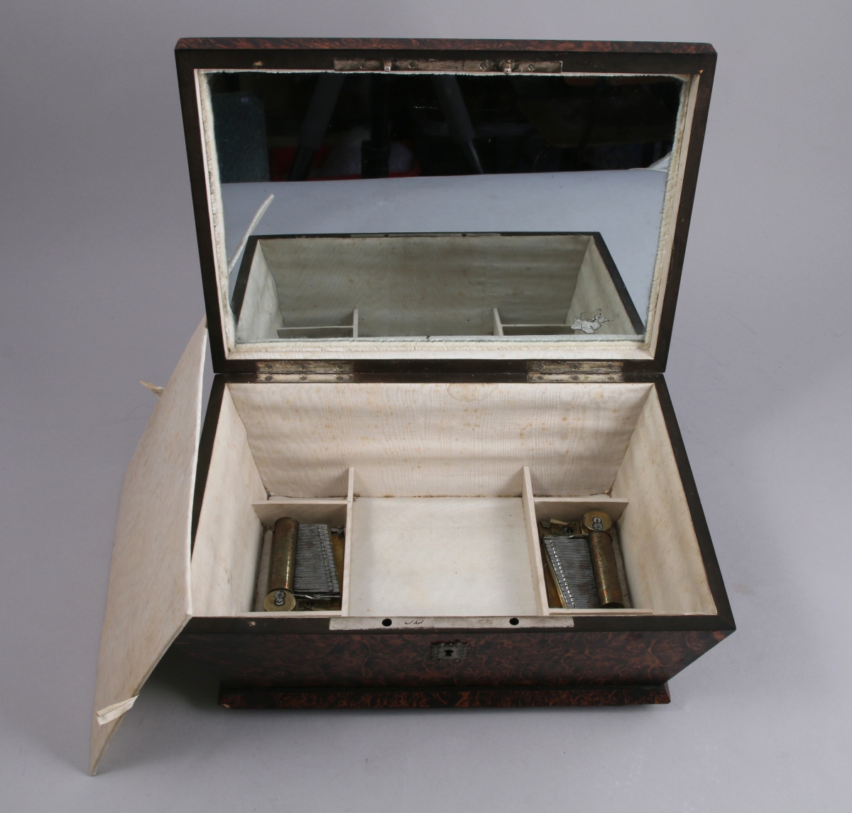 BOITE à BIJOUX MUSICALE de forme trapézoïdale en loupe ramagée. Le couvercle légèrement bombé à une anse reçoit un décor clouté de rinceaux stylisés ; l'intérieur est foncé d'un miroir au mercure. Intérieur garni de moire crème, le fond découvrant les deux mécanismes à cylindres. Quatre pieds boules.