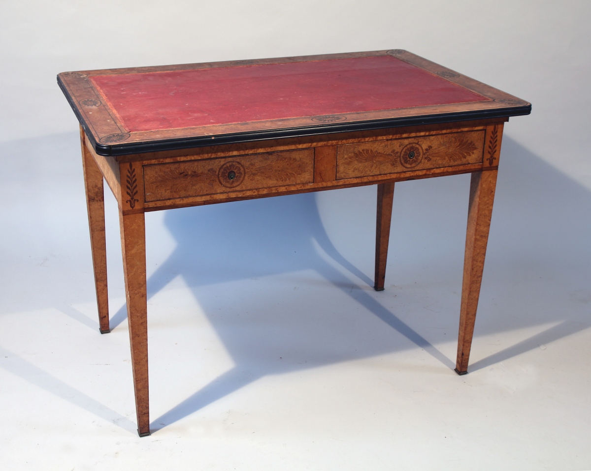 TABLE-BUREAU de forme rectangulaire en placage de loupe d'orme et marqueterie de bois foncé à décor de médaillons fleuronnés, palmettes et filets. Il ouvre à deux tiroirs en ceinture et deux tirettes latérales. Le plateau rapporté, tendu d'un cuir rouge à décor aux petits fers. Le bureau repose sur quatre pieds carrés, fuselés à sabots de bronze.