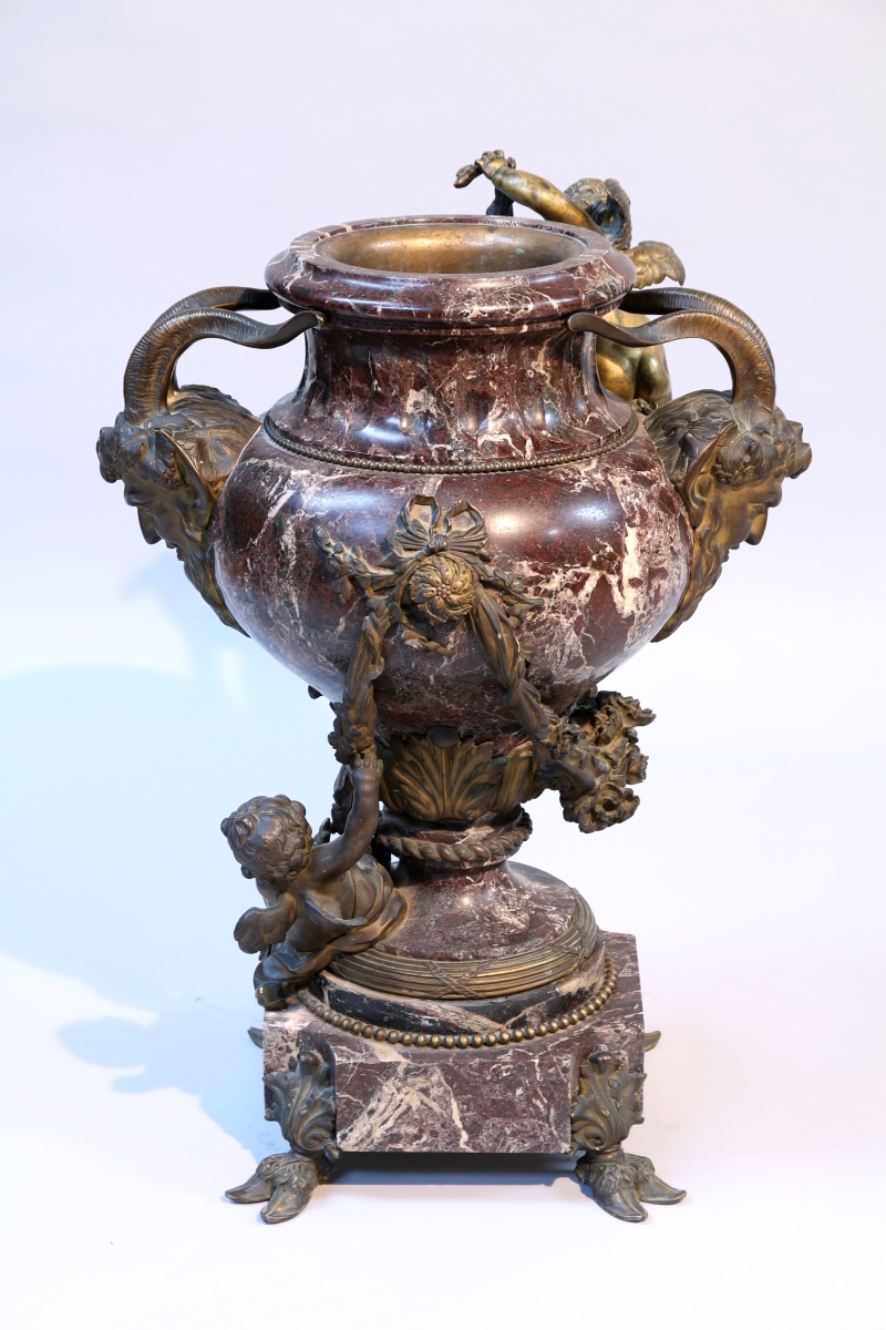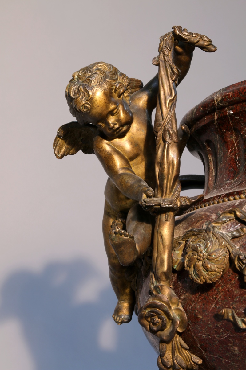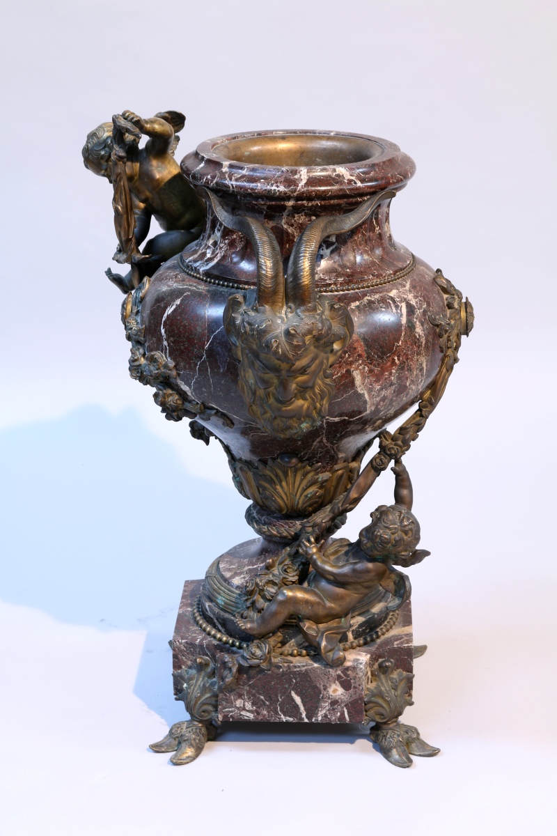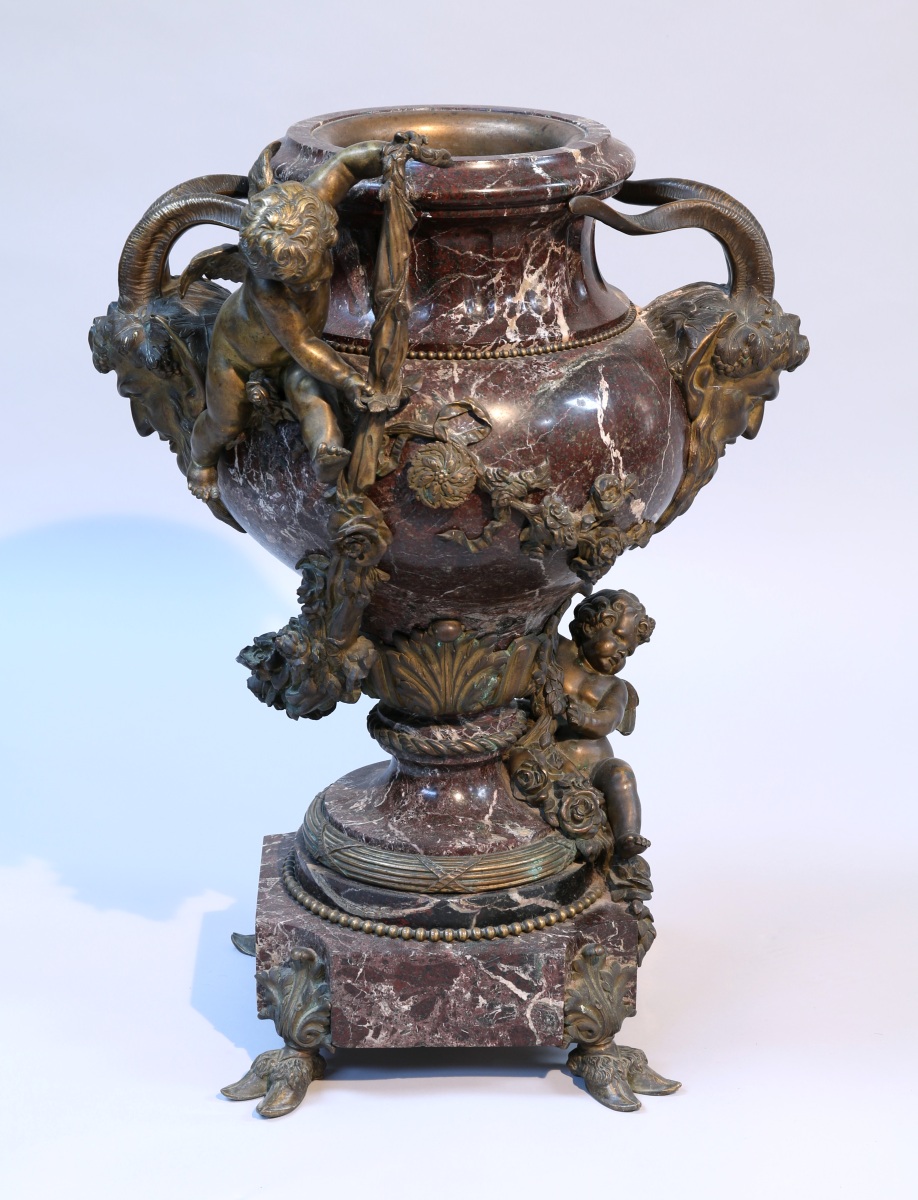 FRÈRES ROBERT. VASE d'APPARAT de forme balustre sur piédouche à col godronné, en marbre Levanto rouge et riche ornementation en bronze doré et ciselé tel que rangs de perles, joncs rubanés et palmettes. La panse du vase ornée de lourdes guirlandes de fleurs pendantes retenues par deux putti ailés en ronde-bosse et des boutons de fleurs. Les anses formées par des masques de satyres. La base de forme carrée repose sur quatre pieds en sabots de boucs à palmettes.