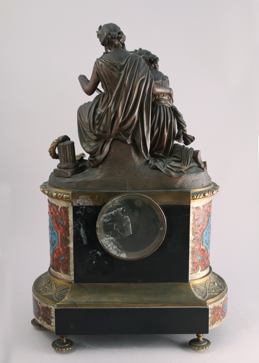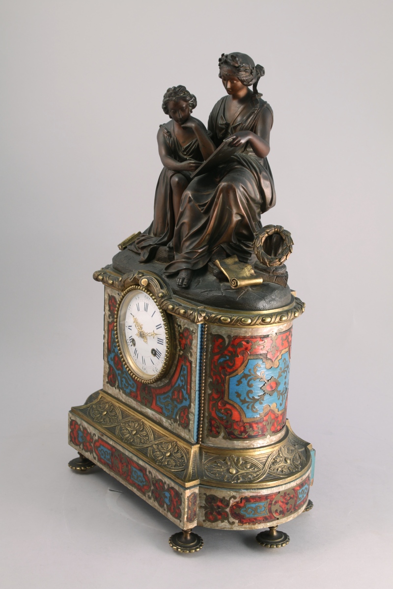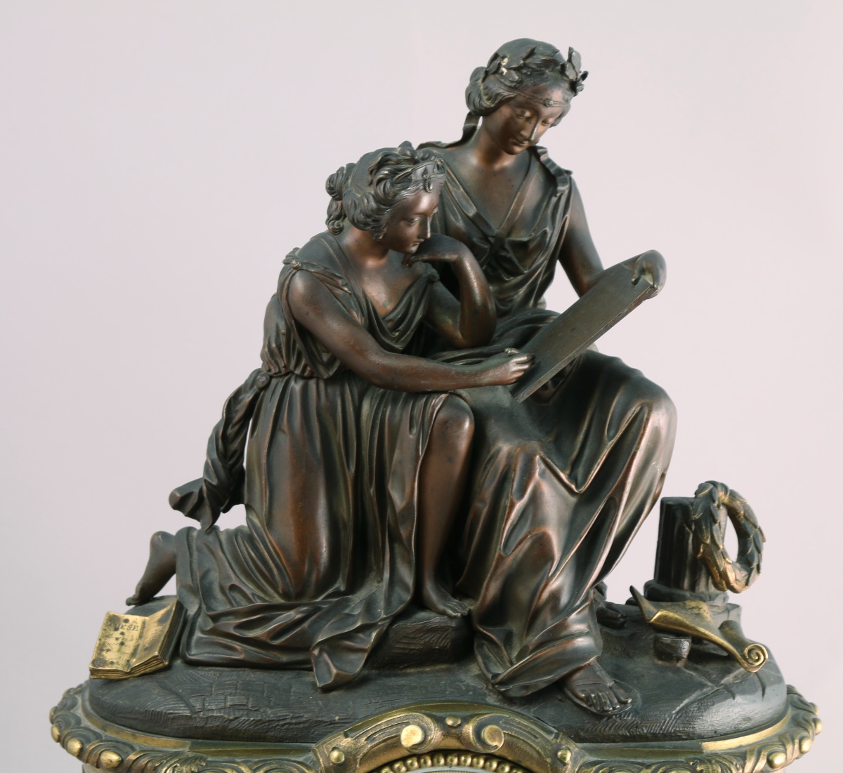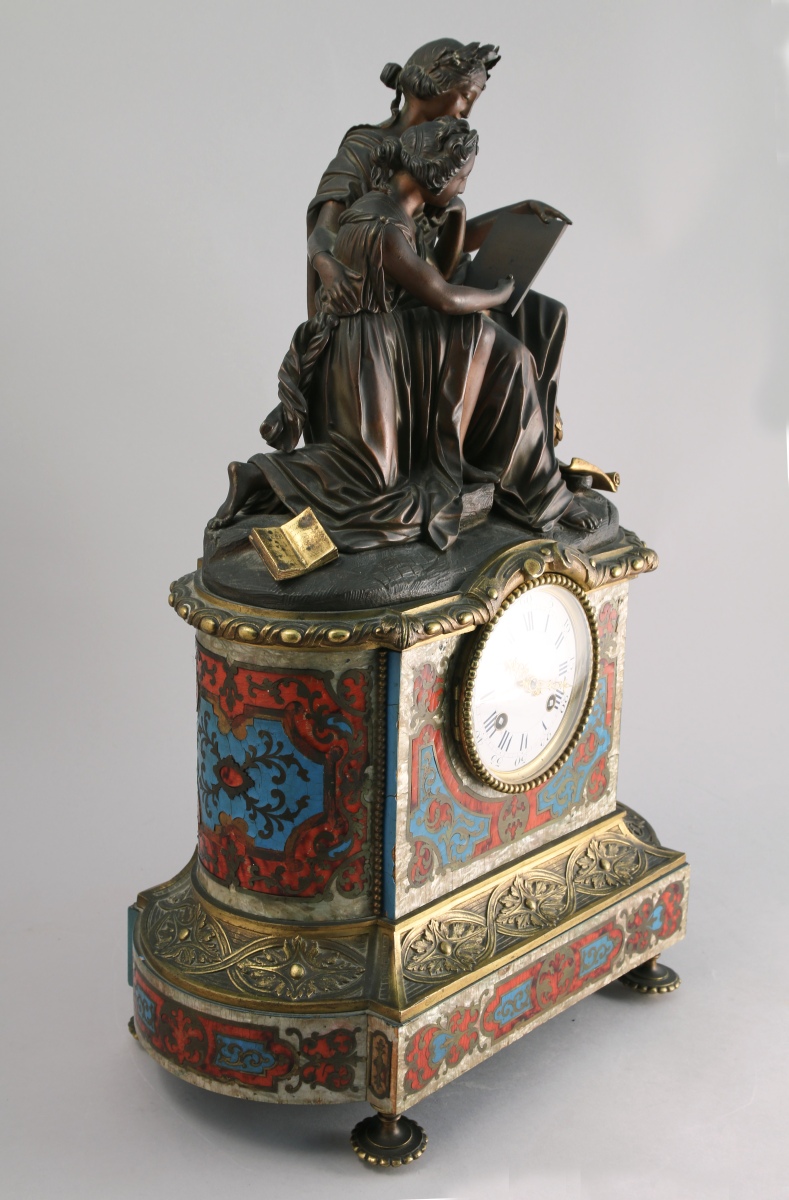 PENDULE à l'ACADÉMIE en bronze patiné figurant un couple de femmes laurées gravant au stylet sur une plaque de marbre "Université de France 1845, Grand Prix décerné à Michel Duclos, né le 15 décembre 1822 à Tours", un phylactère posé au sol inscrit "Prix Montyon 1846, décerné à Michel Duclos". Le bronze repose sur un socle bronze marqueté dans le gout de Boule à l'imitation du corail et de l'émail, sur un fond nacré avec des filets de laiton ; ressaut reposant sur six pieds toupies. Le cadran circulaire gradué pour les minutes avec les heures en chiffres romains. Mouvement avec une suspension à fil.