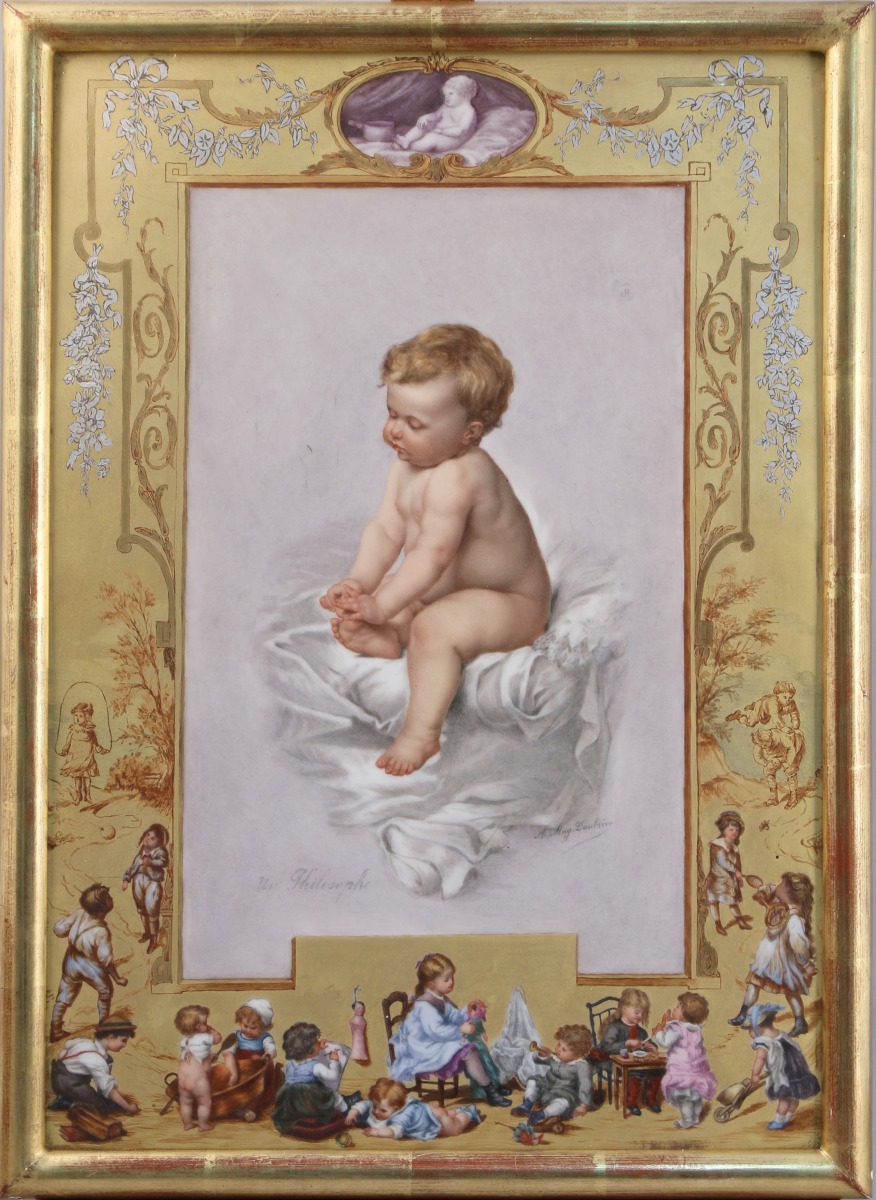 Plaque en porcelaine polychrome, dorée à l'or figurant un putti joufflu nu assis sur sa layette dans un encadrement dans le goût du XVIIIe siècle figurant en haut un enfant en grisaille, et des farandoles animées de jeux enfantins. 17 petits personnages illustrent des scènes des plus vivantes: grisaille, jeu de volants, saute-mouton, dinette, enfants jardiniers, jeu de la poupée, dessin, bain, billes, ballon et corde à sauter.. Signé et titré.