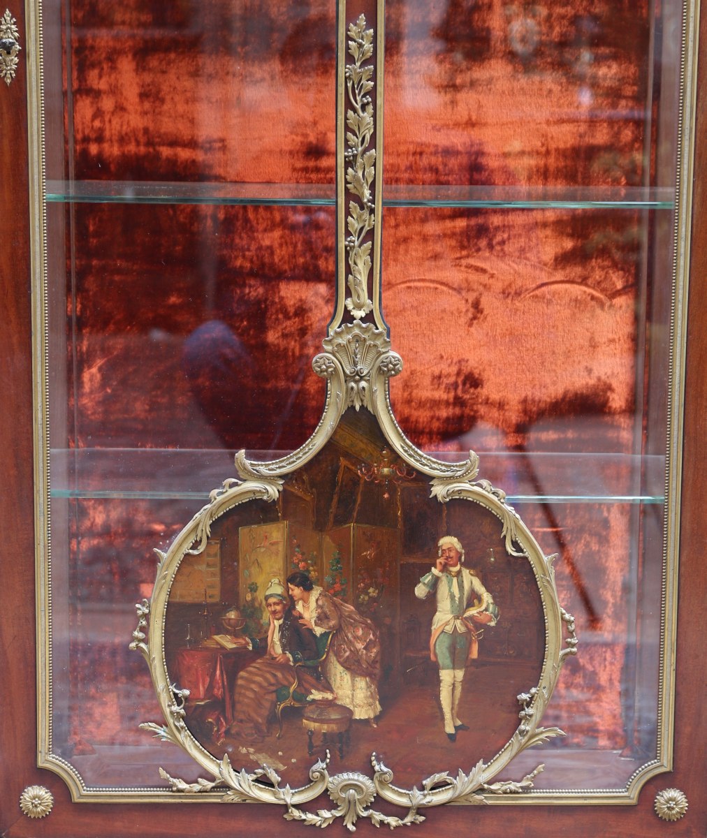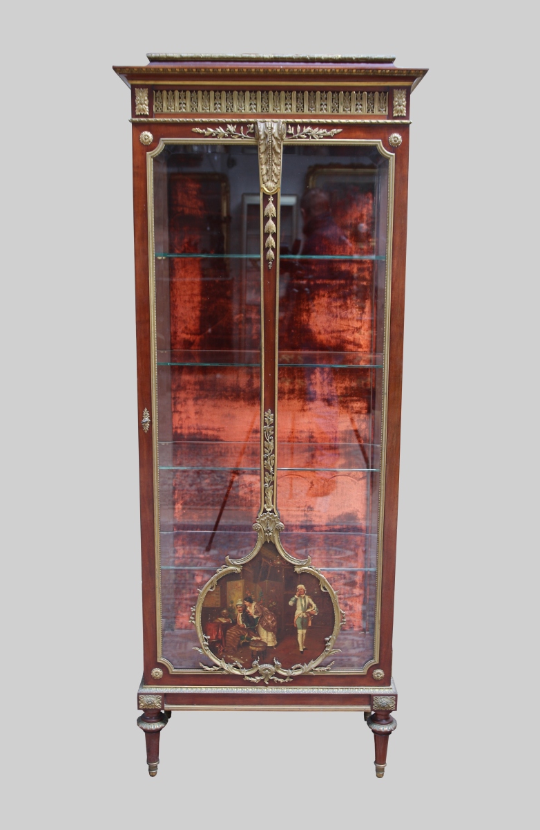 MAJORELLE. VITRINE en acajou ouvrant à une porte vitrée. Cartouche inférieur central orné d'une scène peinte au couple libertin et vieillard consentant. Dessus à doucine. Elle repose sur quatre pieds toupie. Riche ornementation en bronzes finement ciselés et dorés au riche répertoire iconographique fin XVIIIe. Cotés aux vitres biseautées.