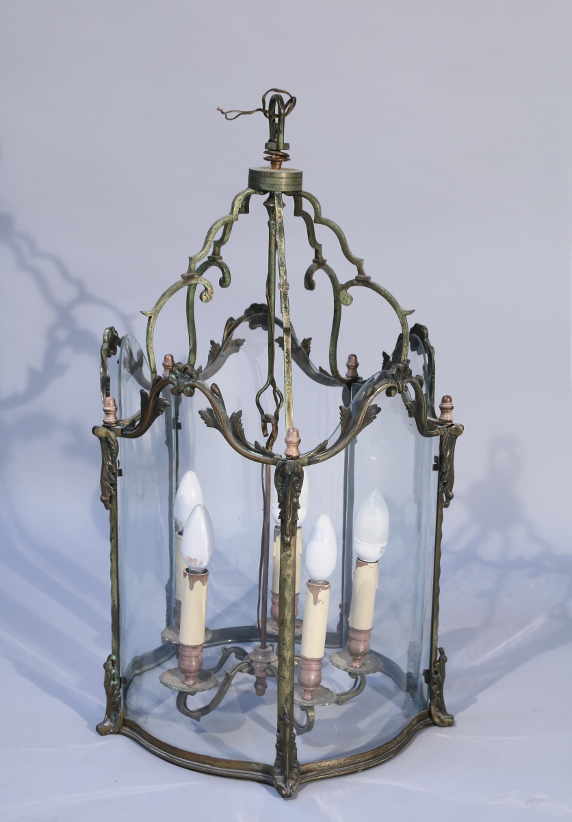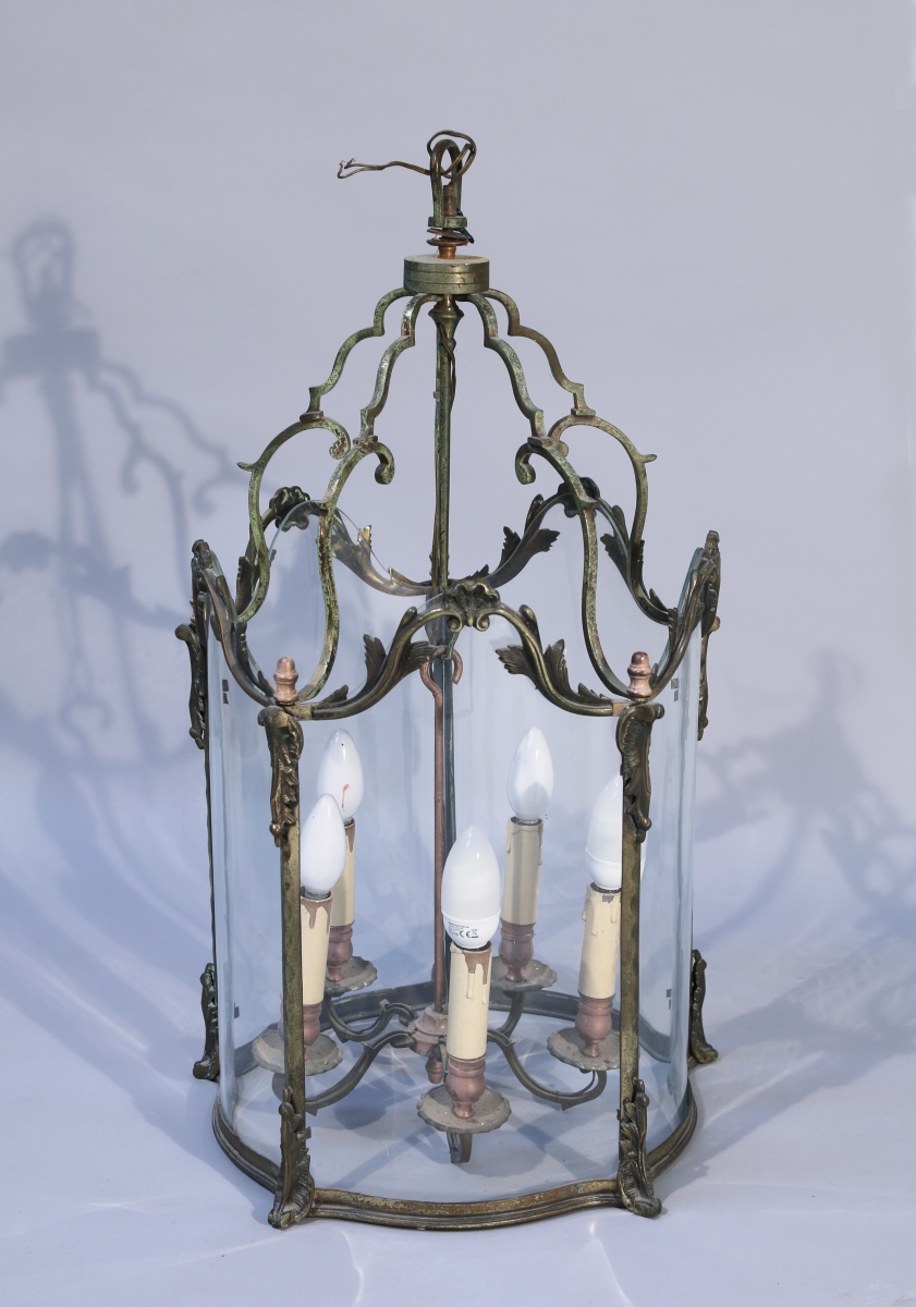 LANTERNE pentagonale à côtés mouvementés, en verre et bronze ciselé, à cinq lumières. Les arêtes ornées de motifs feuillagés et coquilles. Surmontée d'une suspension à cinq bras mouvementés.