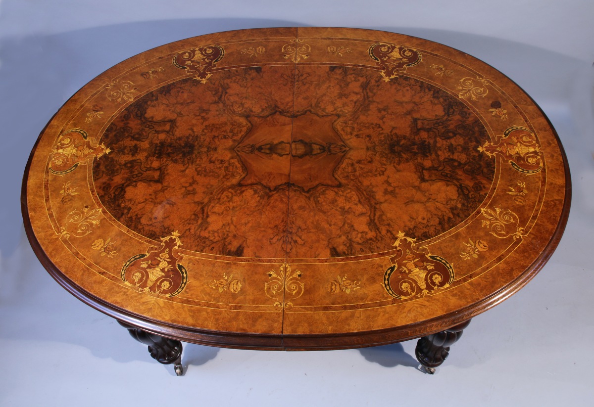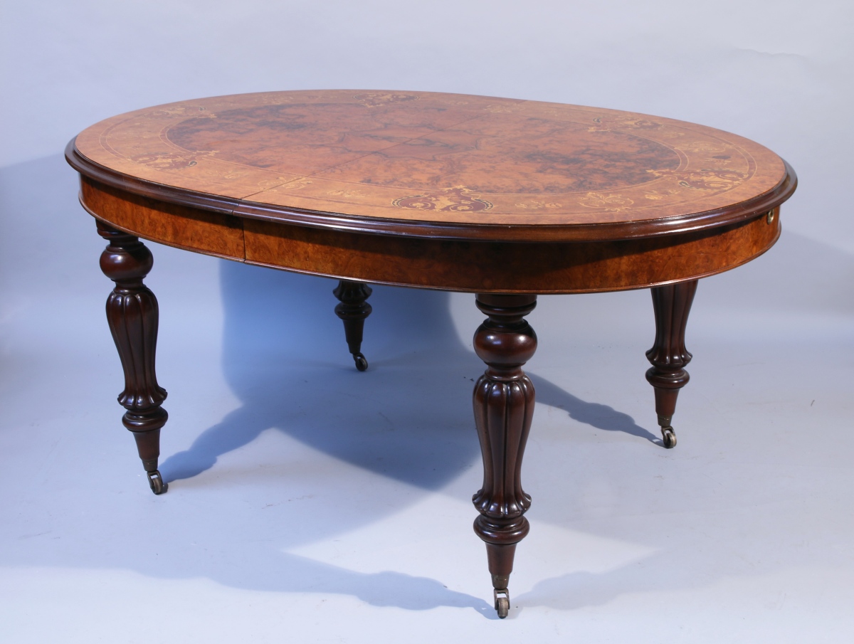 TABLE de SALLE à MANGER de forme ovale en placage de loupes. Plateau à riche décor marqueté de vases fleuris et volutes feuillagées. Elle repose sur 4 pieds parapluie.