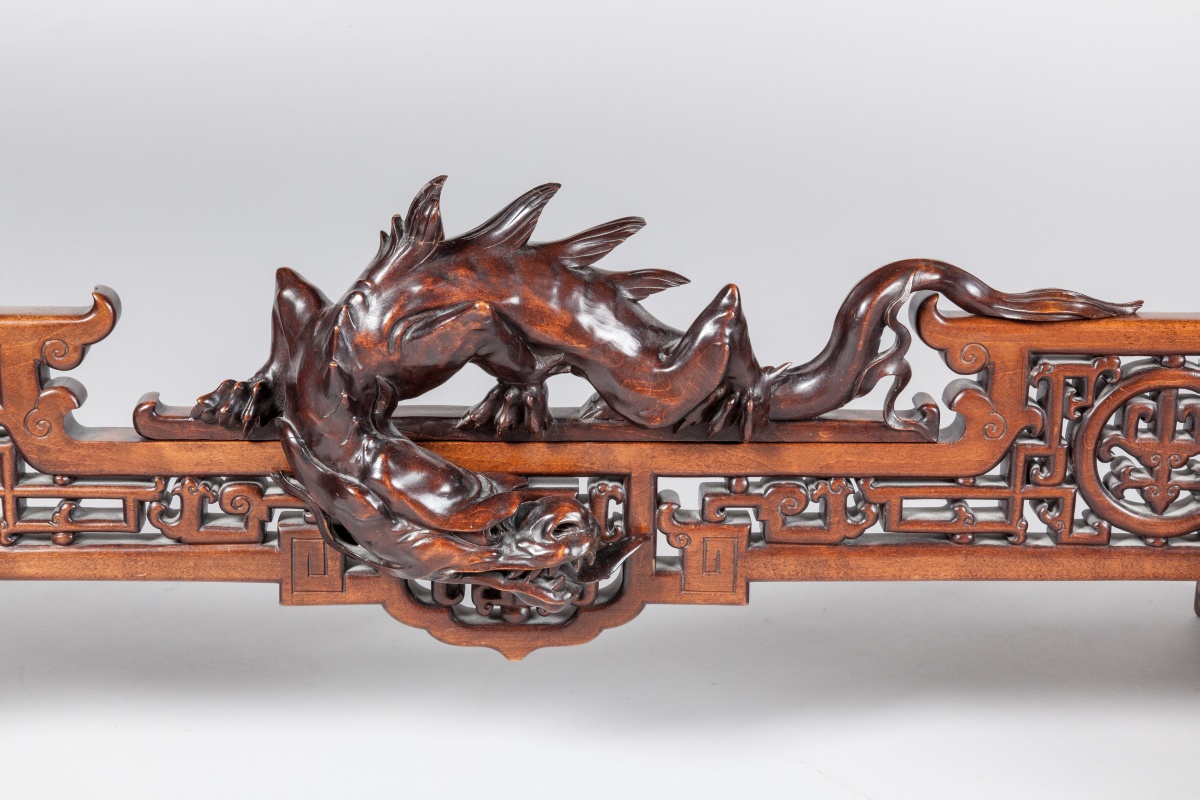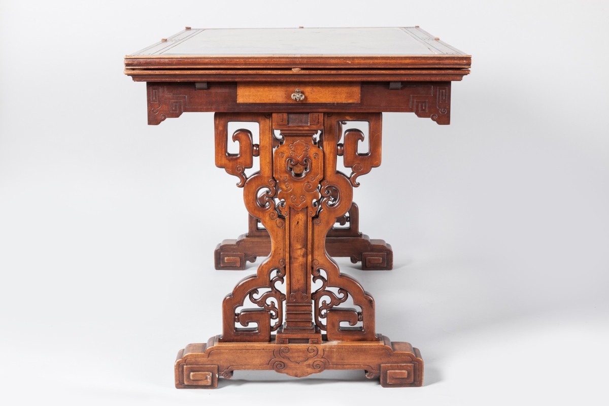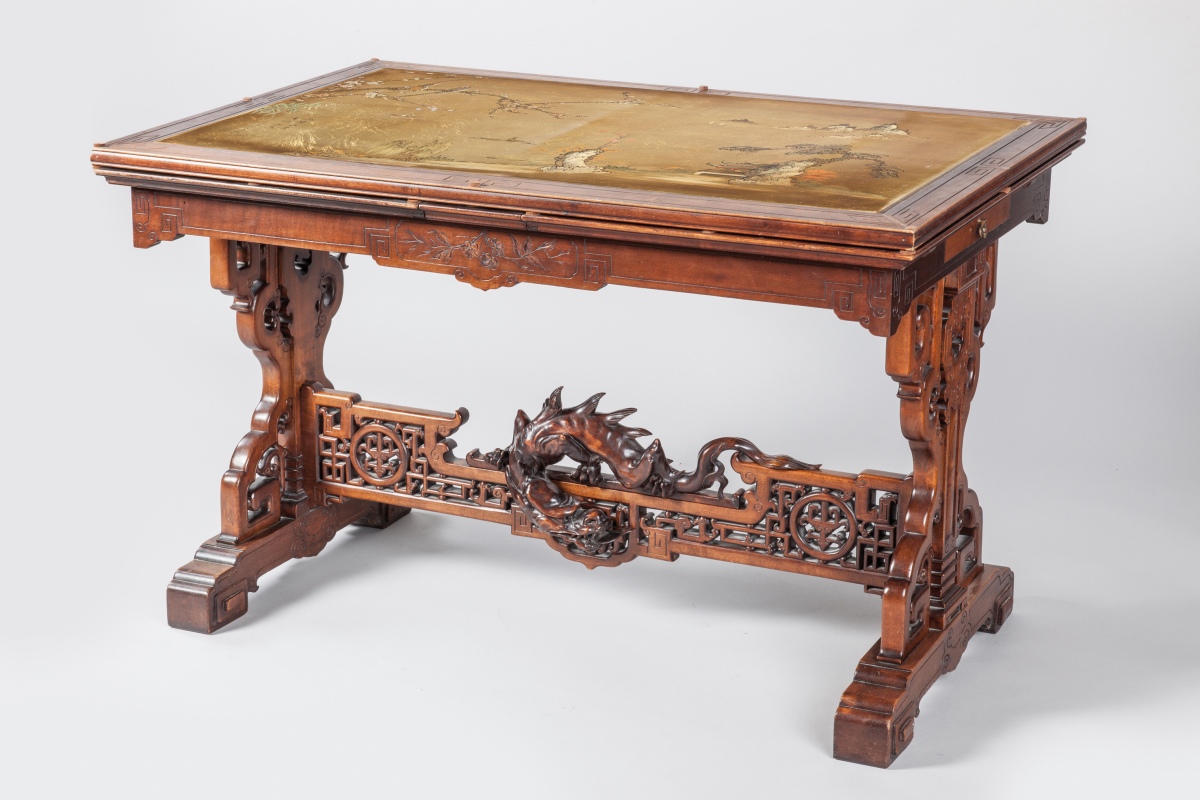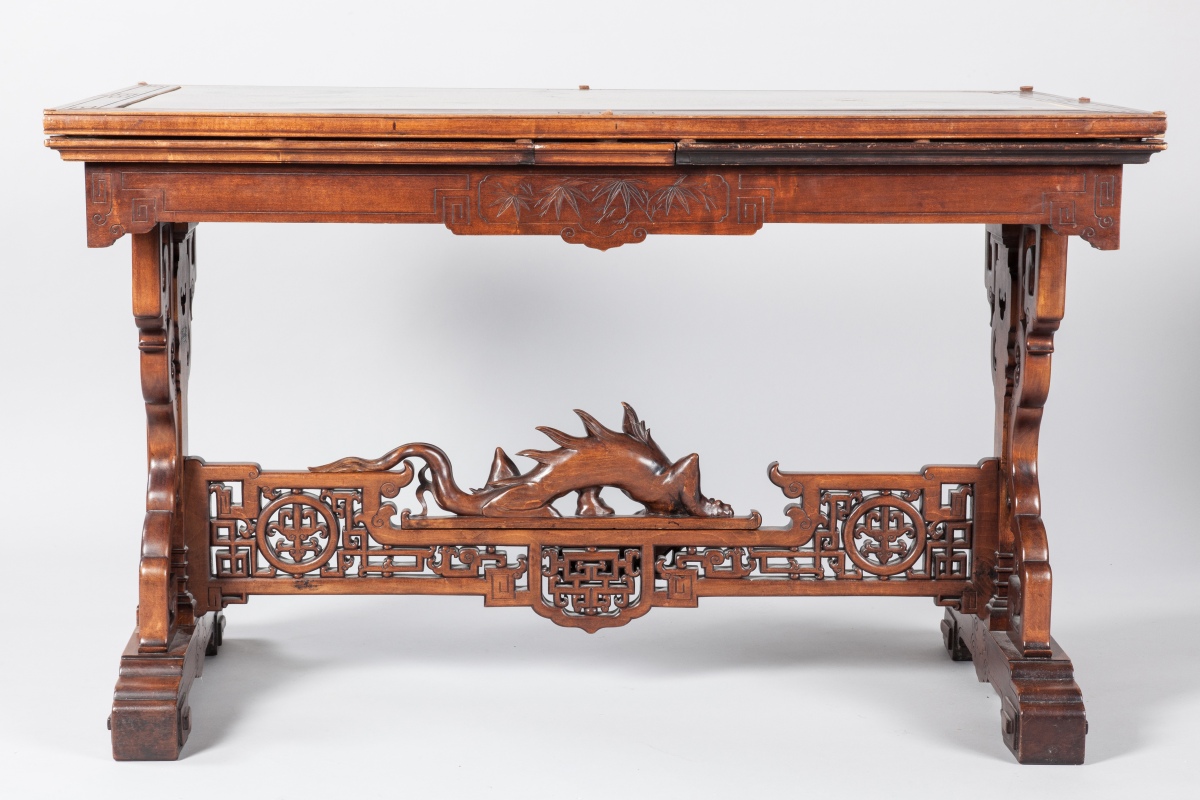 Gabriel VIARDOT (Paris, 1830-1906). TABLE DE BIBLIOTHÈQUE en bois exotique sculpté et gravé. Le plateau de forme rectangulaire est recouvert d'une peinture japonaise à décor de pagode et d'oiseaux branchés sur un fond doré à la feuille. Il s'ouvre en partie latérale par deux tirettes ornées de façon similaire et deux tiroirs. Ceinture gravée de filets à la grecque et centrée de fleurs et bambous. Deux pieds patins ajourés d'enroulements japonisants sont réunis par une entretoise ornée d'un spectaculaire dragon sculpté en ronde bosse.