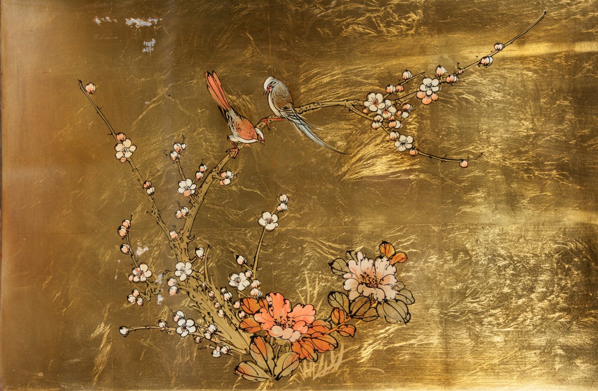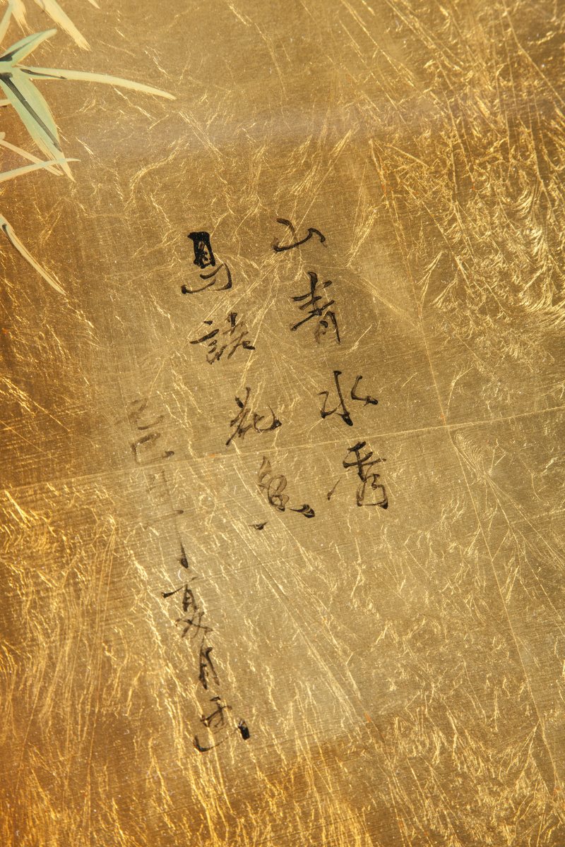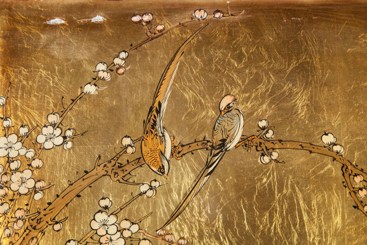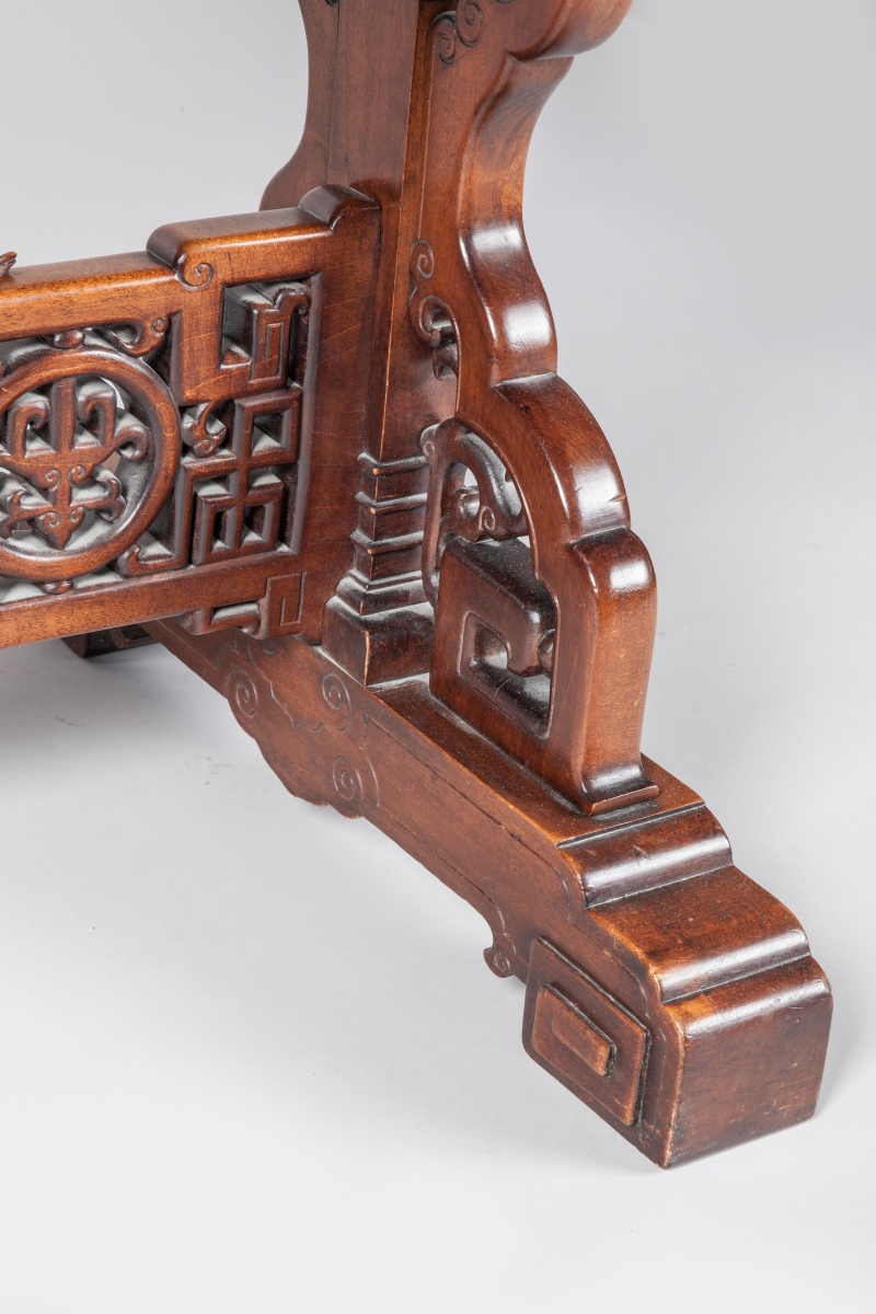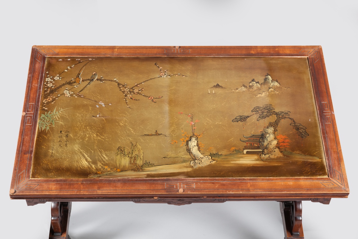 Gabriel VIARDOT (Paris, 1830-1906). TABLE DE BIBLIOTHÈQUE en bois exotique sculpté et gravé. Le plateau de forme rectangulaire est recouvert d'une peinture japonaise à décor de pagode et d'oiseaux branchés sur un fond doré à la feuille. Il s'ouvre en partie latérale par deux tirettes ornées de façon similaire et deux tiroirs. Ceinture gravée de filets à la grecque et centrée de fleurs et bambous. Deux pieds patins ajourés d'enroulements japonisants sont réunis par une entretoise ornée d'un spectaculaire dragon sculpté en ronde bosse.