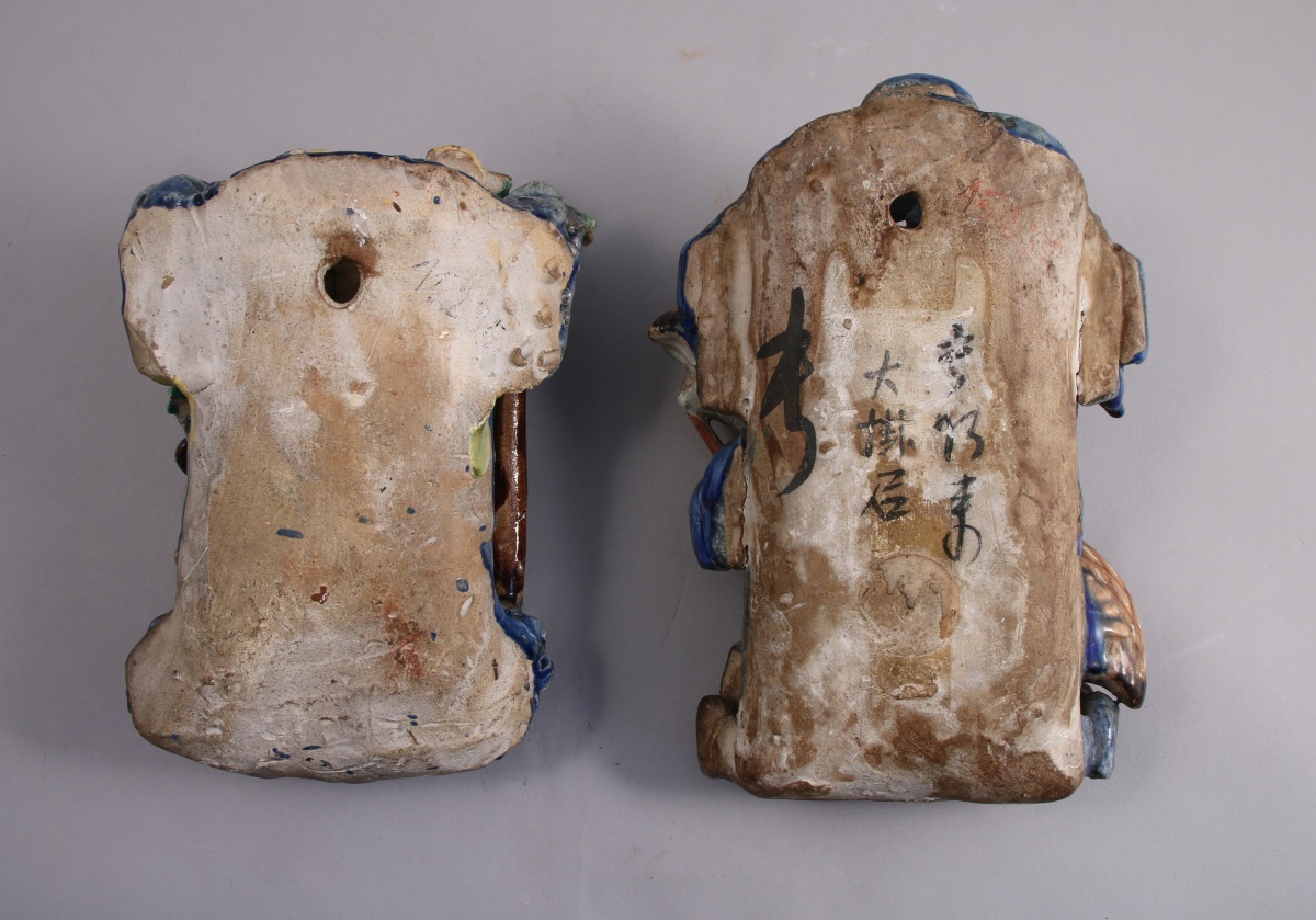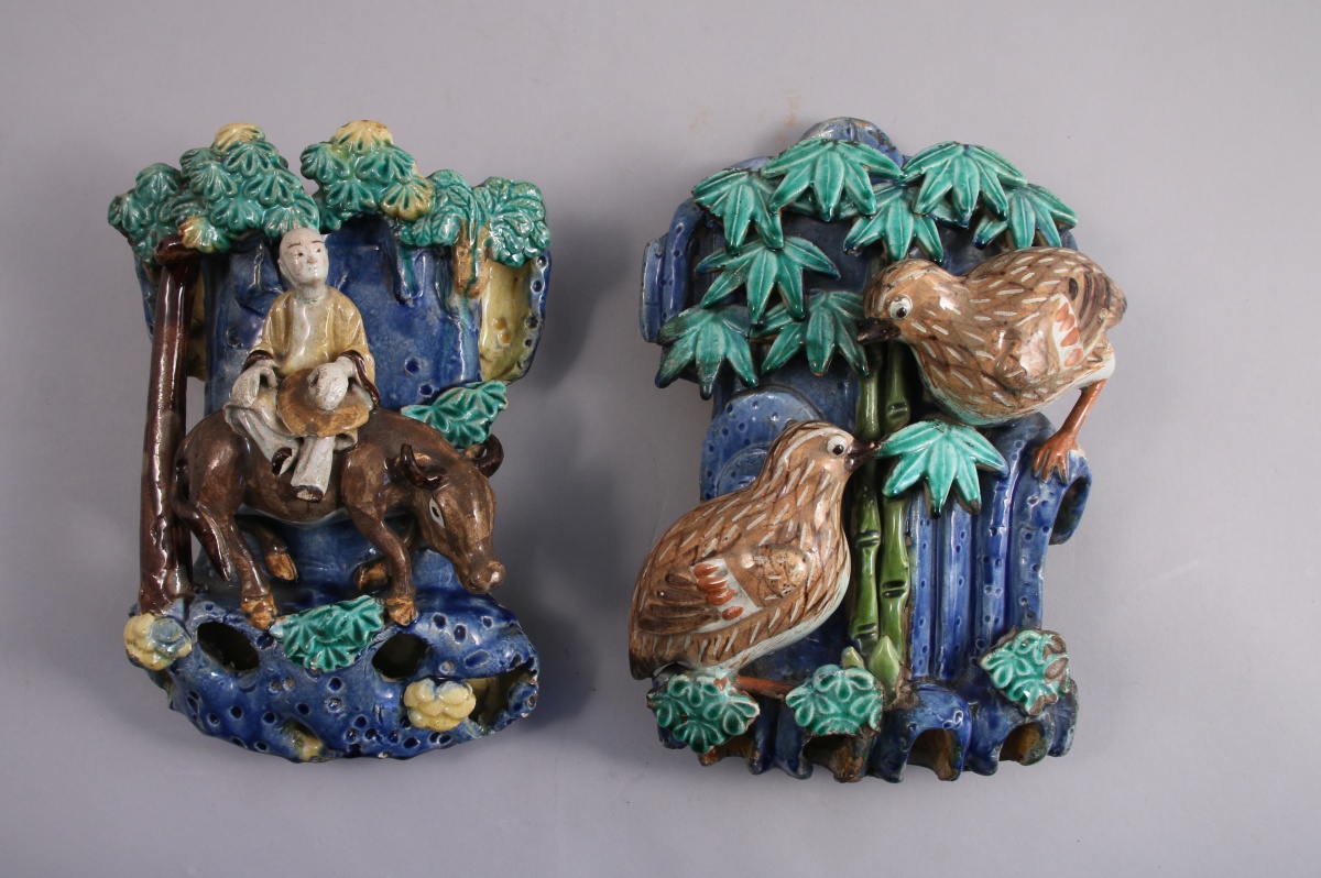 CHINE. Paire de BOUQUETIERES en terre cuite vernissée polychrome. Dans un décor au naturel animé pour l'une d'un sage sur un boeuf, pour l'autre de deux cailles, une inscription au dos.