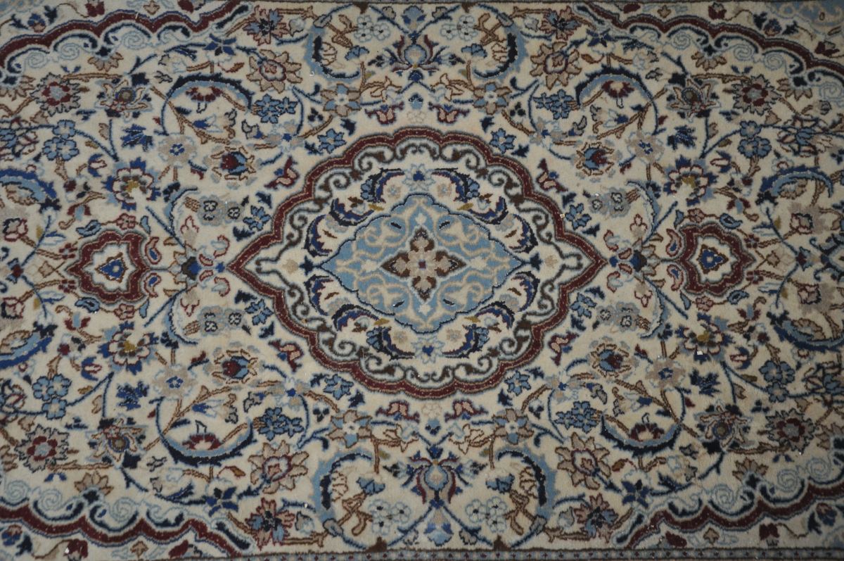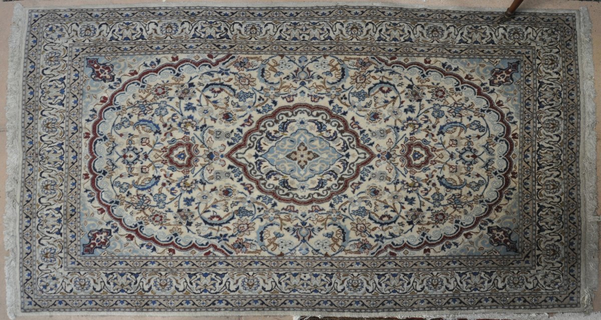 PERSE. TAPIS d'ORIENT en laine à médaillon, décor foral dans la dominante bleue. Perse, Naïn.