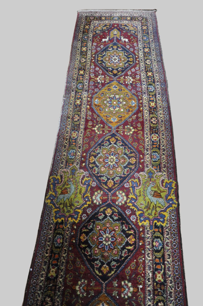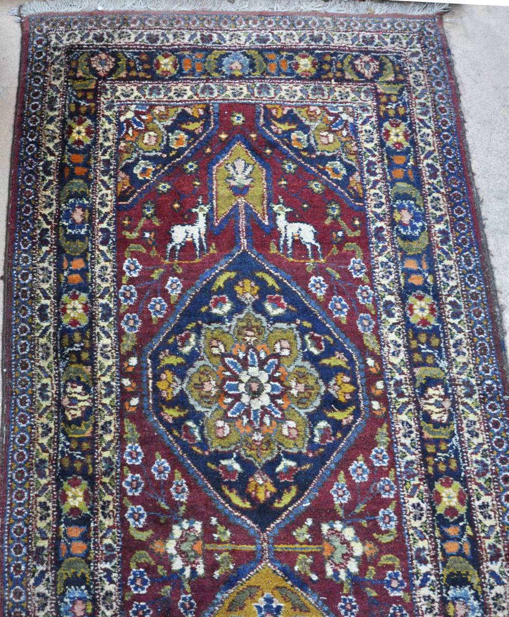 GALERIE d'ORIENT en laine à fond rouge à riche décor floral polychrome articulé autour de cinq médaillons centrés d'un fleuron. Deux cartouches chantournés centrés d'un oiseau en partie centrale. Deux biches sont figurées à une extrémité. Bordure à fond bleu entre deux contre-bordures à fond jaune.