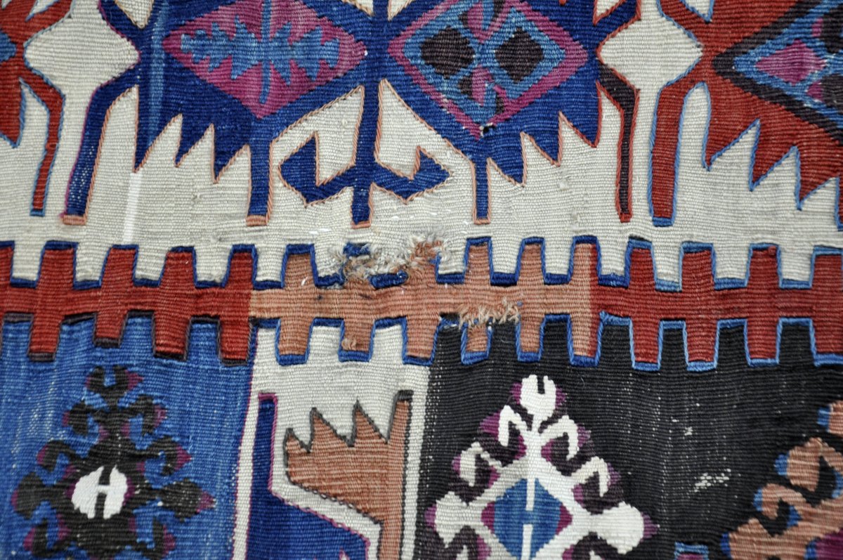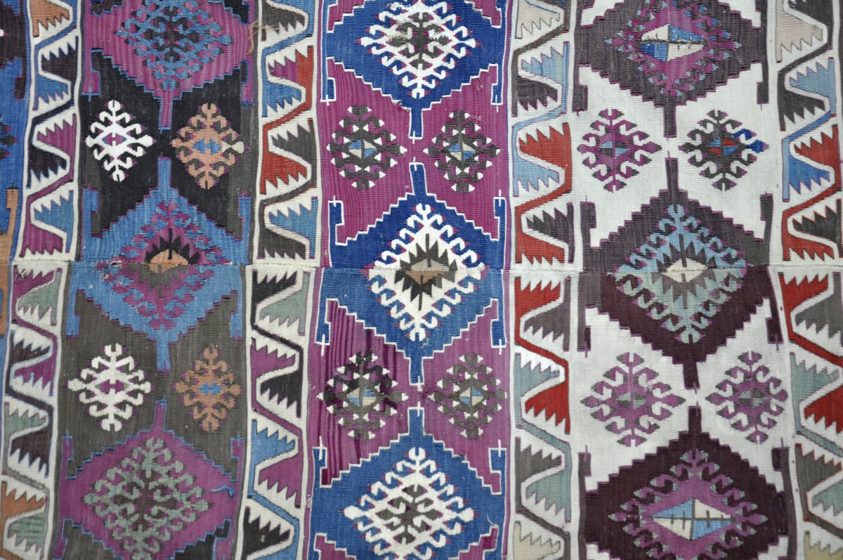 TAPIS KILIM en laine à fond crème. Il se divise en cinq registres (bleu, brun, mauve, crème et marron) accueillant un décor de croix à rayons recourbés et motifs végétaux stylisés. Il se compose de deux tissages cousus ensemble en partie centrale.