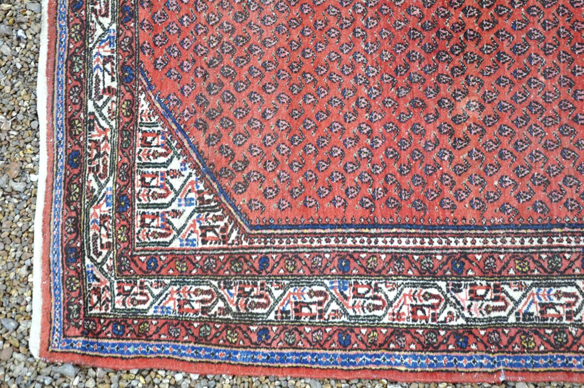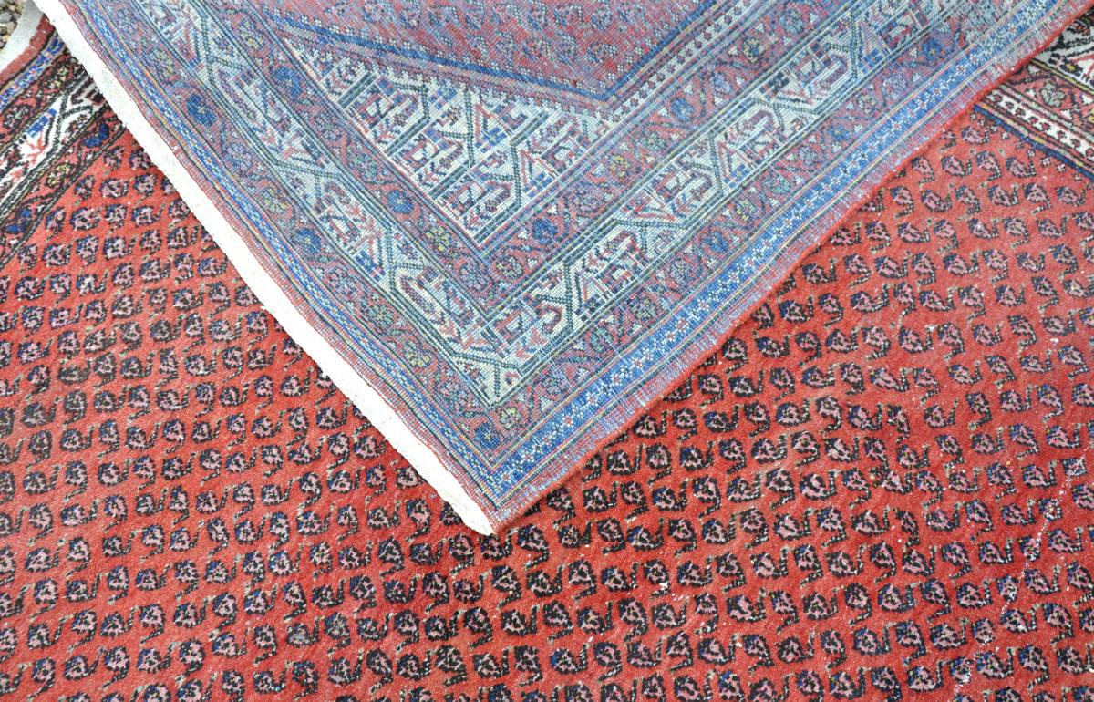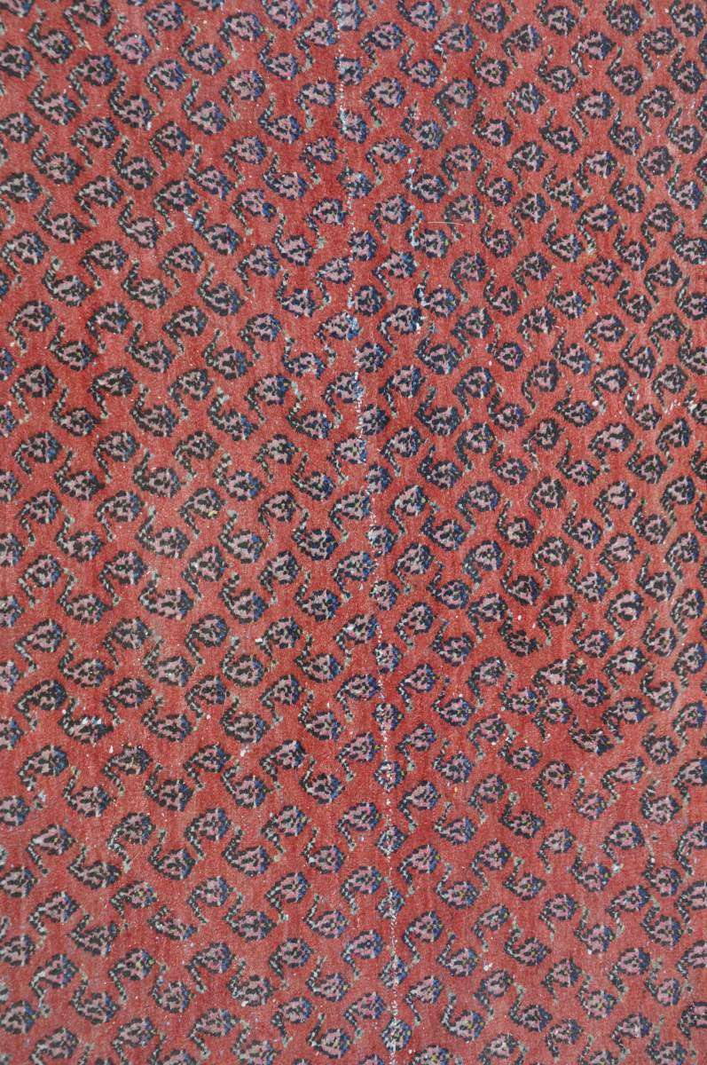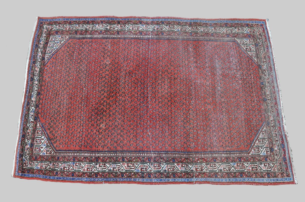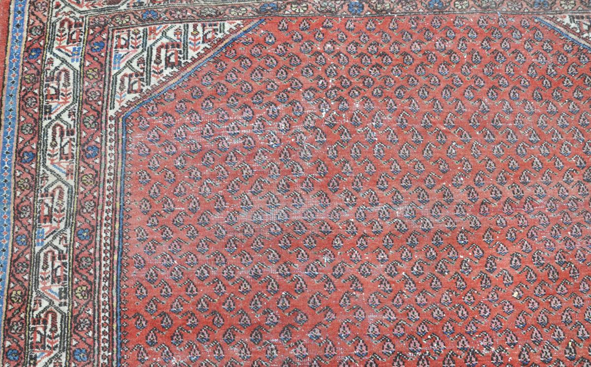 PERSE (?) TAPIS en laine à fond rouge à motif d'un semi de botehs. Bordure à fond crème flanquée de deux contre-bordures à fond rouge et d'une bleue à frises florales stylisées.