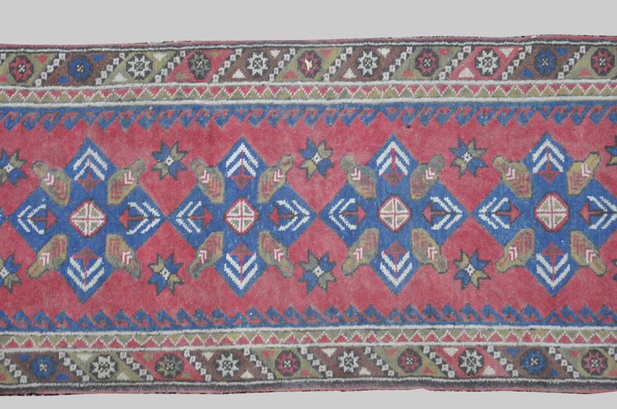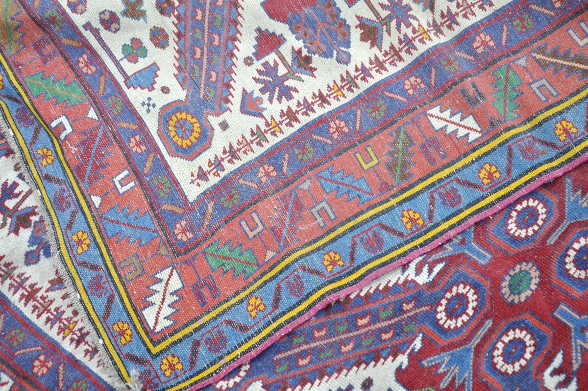 CAUCASE et ASIE MINEURE. Réunion de TROIS TAPIS et d'une GALERIE en laine à décor floral et géométrique polychrome.