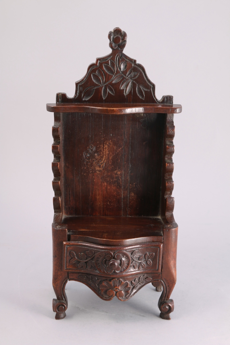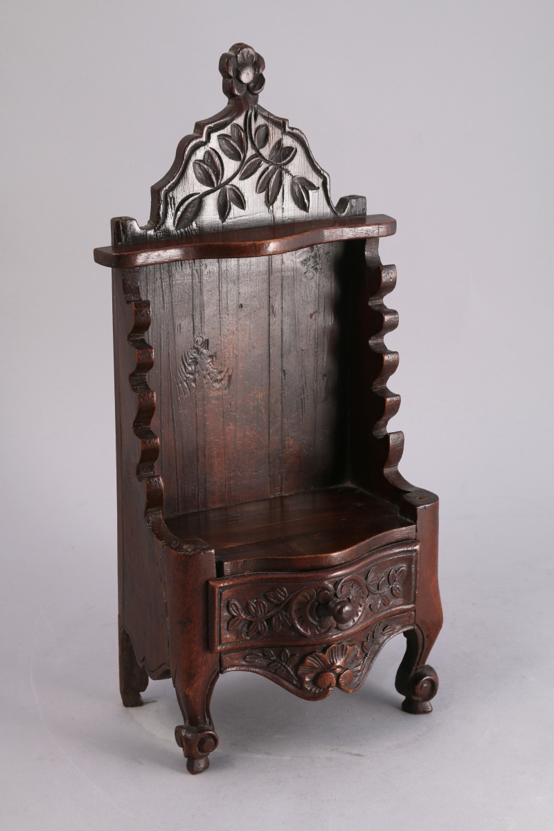 BOÎTE PORTE-COUTEAUX dite "COUTELIERO" de forme chantournée en noyer mouluré et sculpté de fleur ouvrant par un petit tiroir en partie inférieure.