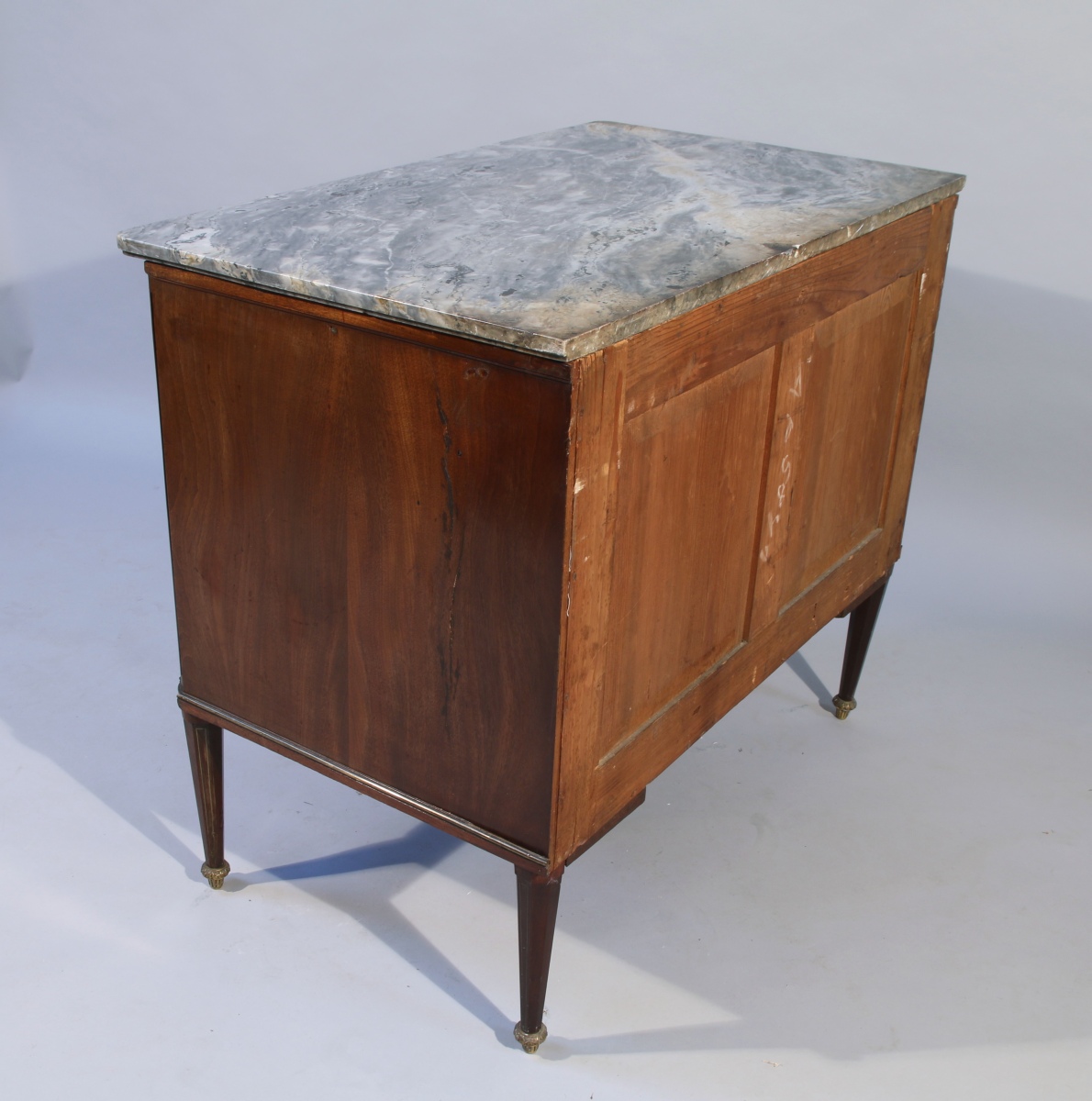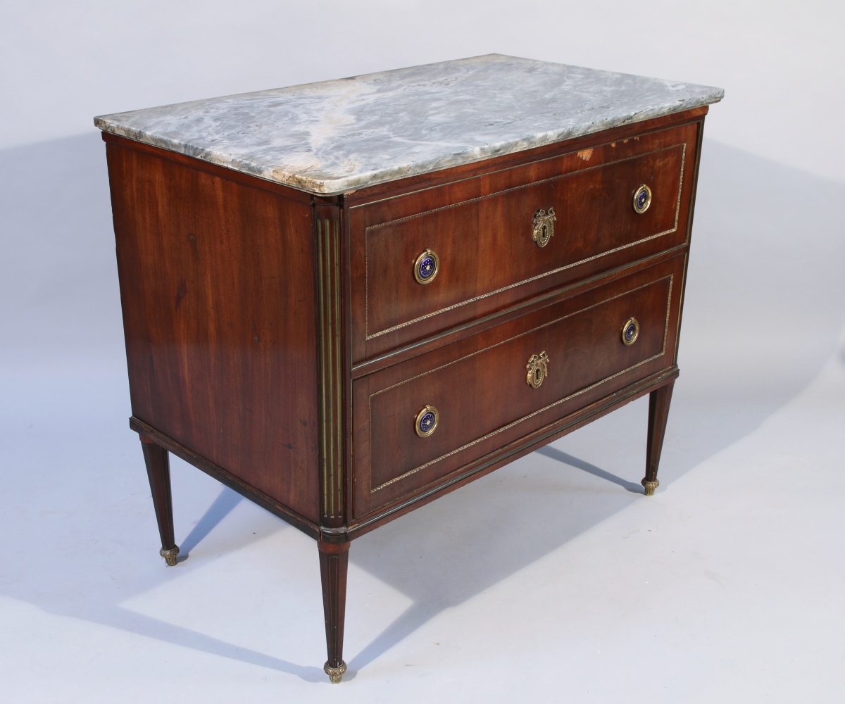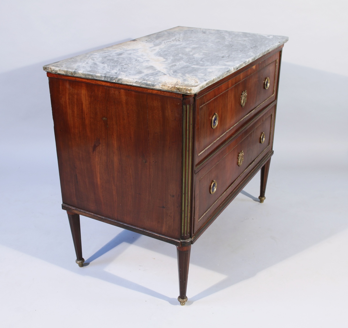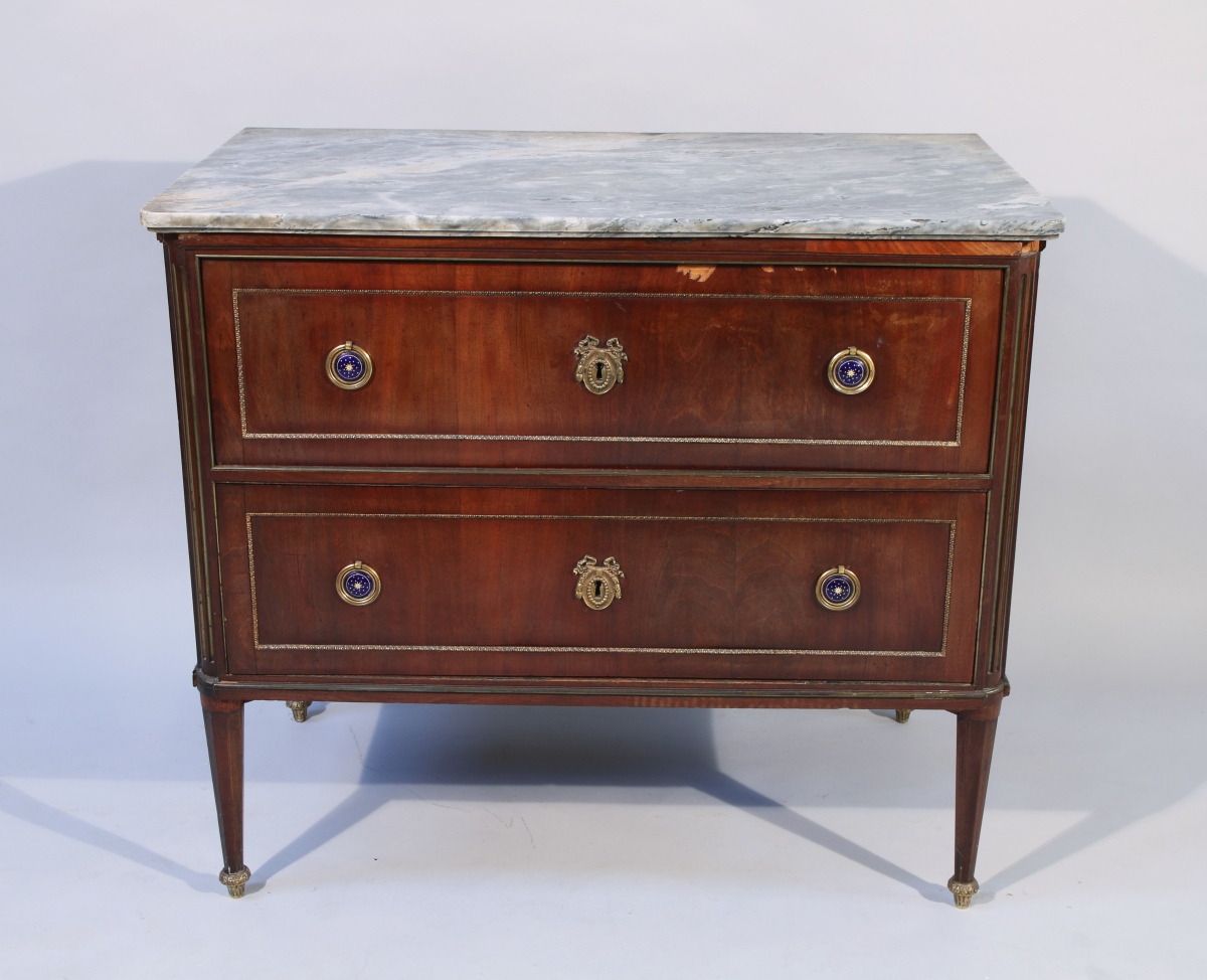 COMMODE en noyer et placage de noyer teinté à la façon de l'acajou ouvrant par deux tiroirs sans traverse. Les montants antérieurs cannelés. Elle repose sur quatre pieds fuselés à pans octogonaux. Garniture de bronzes ciselés et dorés tels que frise de rais de coeur en encadrement, poignées de tirage mobiles centrées d'un médaillon émaillé bleu nuit orné d'étoiles d'or, entrées de serrures rubanées et sabots feuillagés. Dessus de marbre gris.