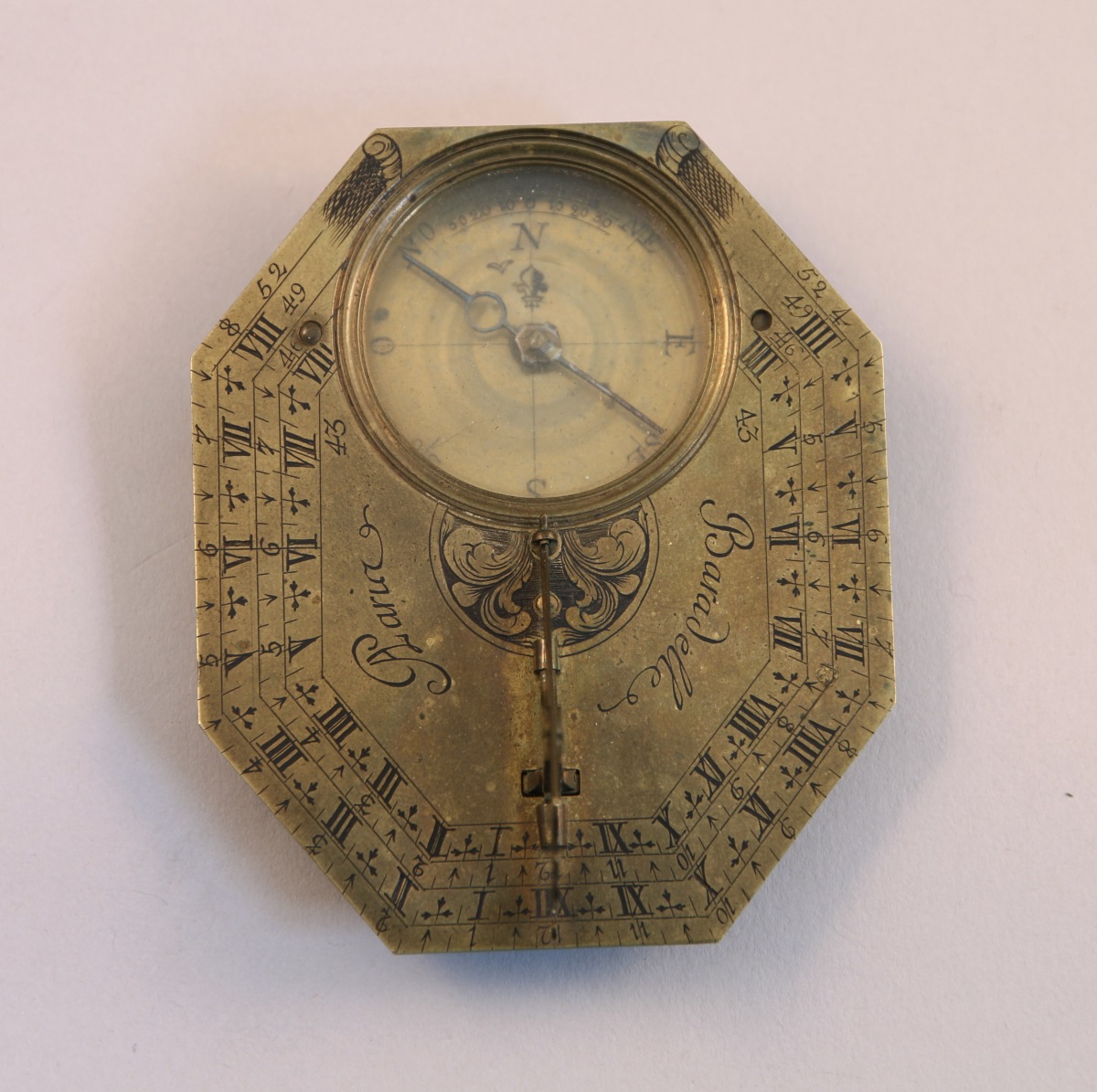 CADRAN solaire horizontal de poche de type BUTTERFIELD en laiton. Platine octogonale avec boussole et style "à l'oiseau".