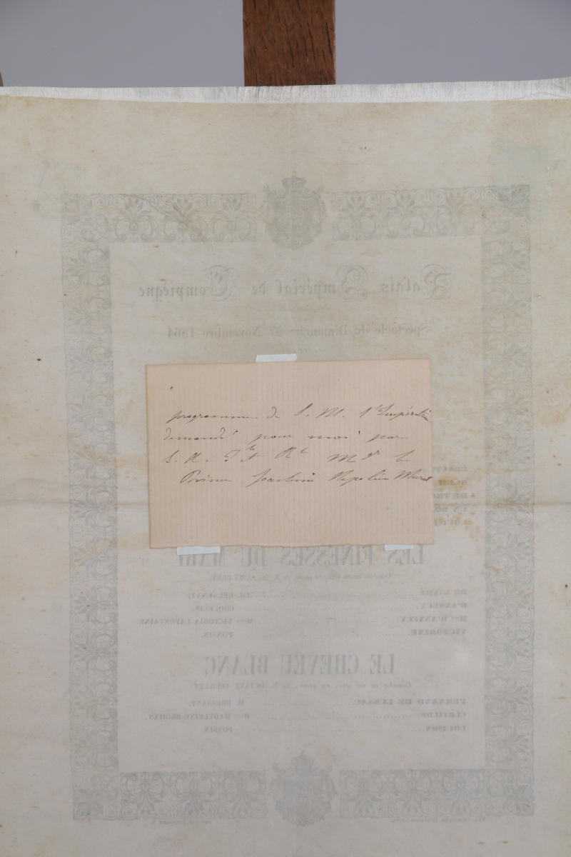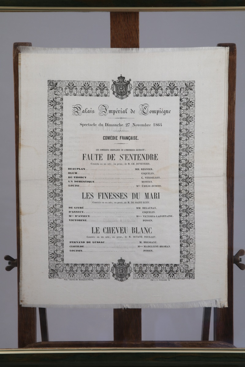 MOUCHOIR en soie imprimé d'un programme théâtral, donné au Palais Impérial de Compiègne le 27 novembre 1864 par la Comédie Française. Les pièces jouées furent "Faute de s'entendre", "Les finesses du mari" et "Le cheveu blanc".