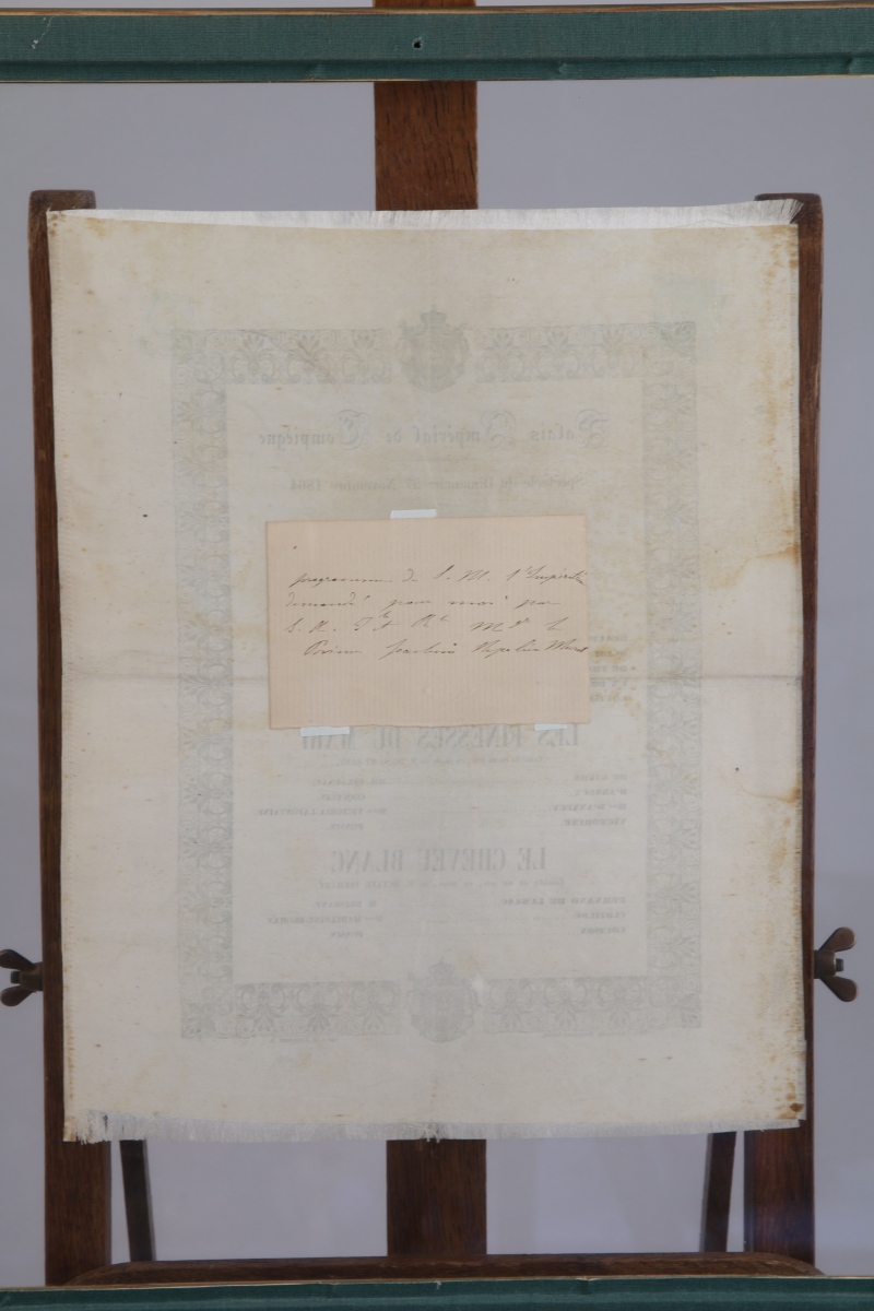 Étiquette manuscrite au revers attestant que ce mouchoir donné par le Prince Joachim Napoléon Murat serait celui de l'Impératrice Eugénie.