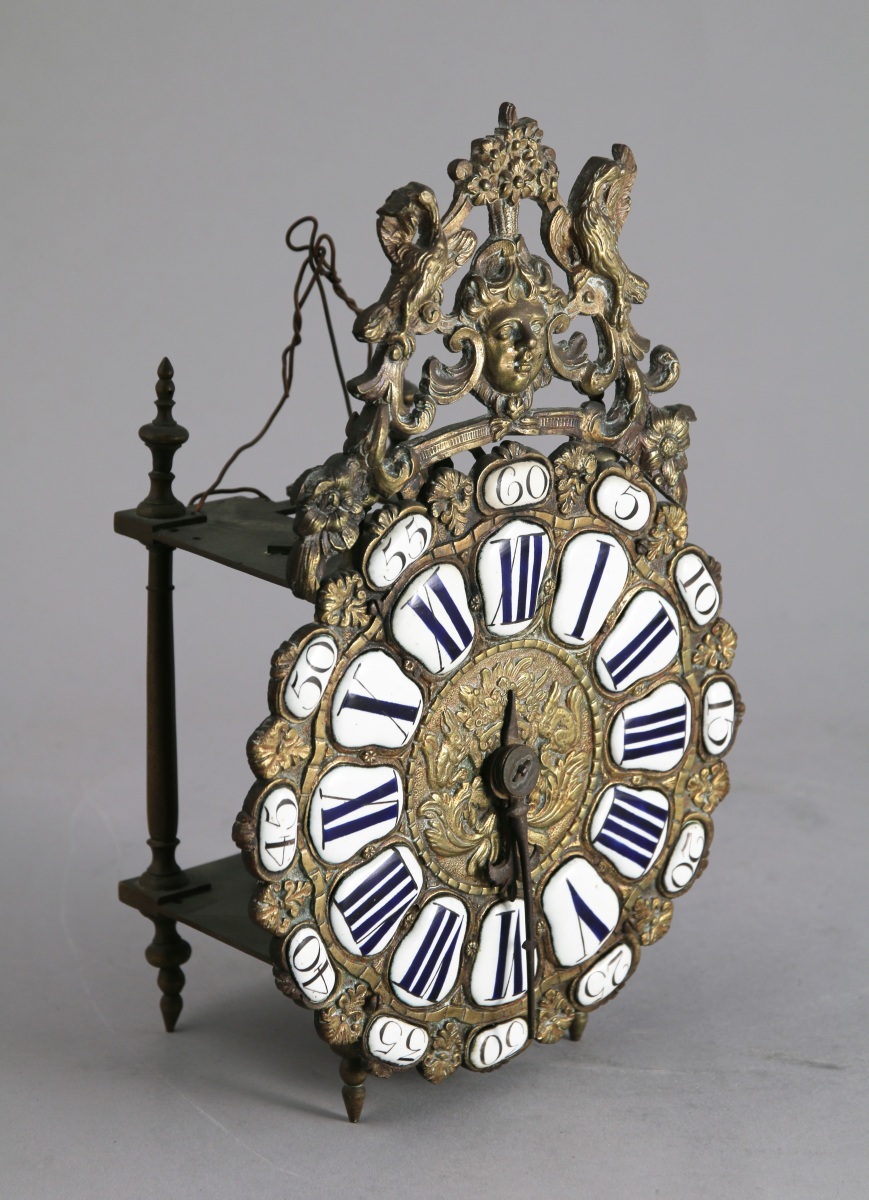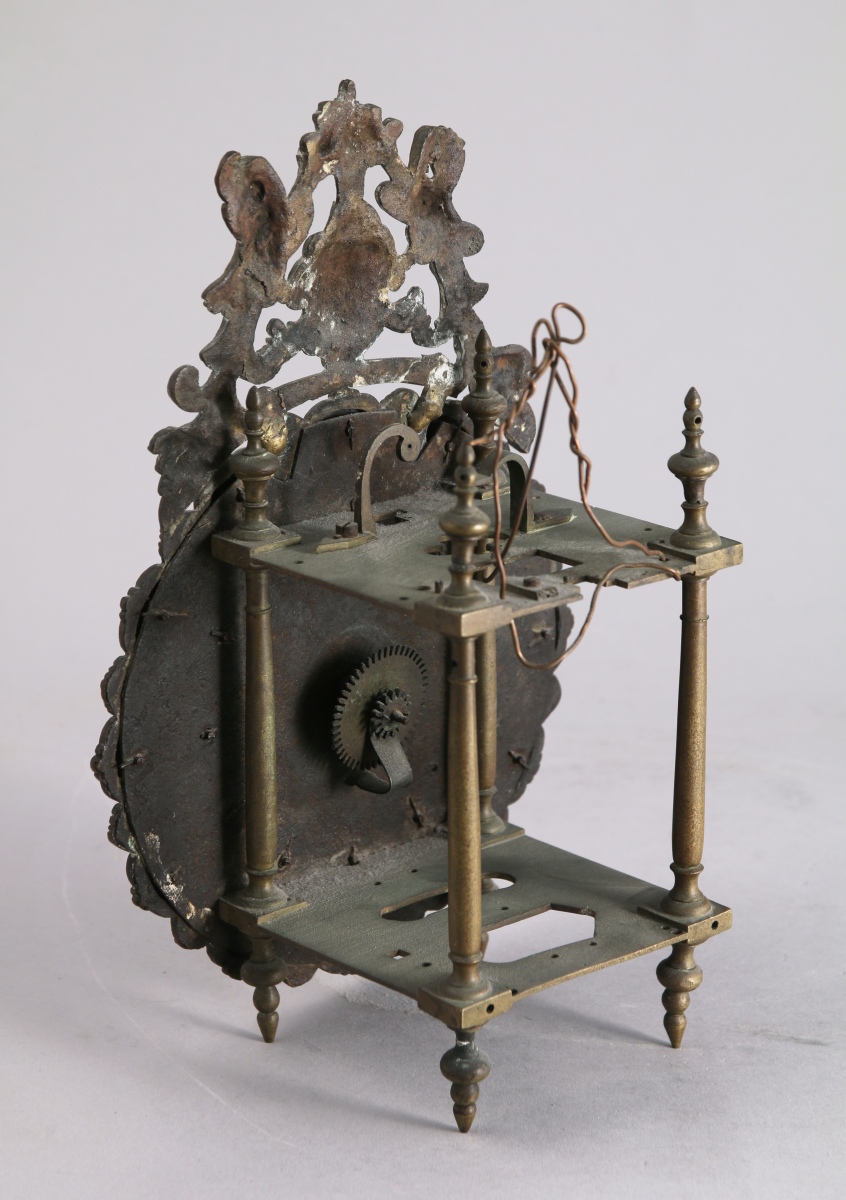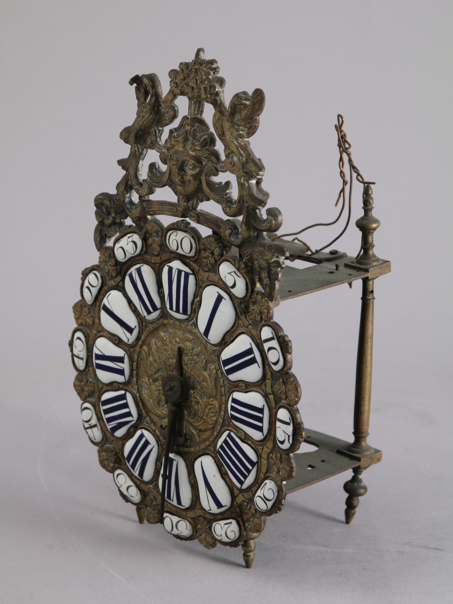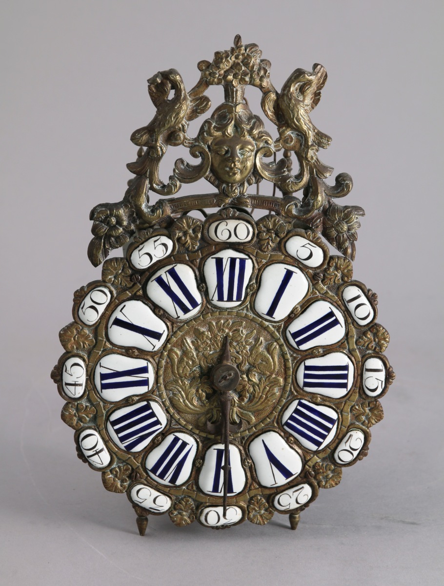 CADRAN d'HORLOGE de forme circulaire en bronze, à l'amortissement un mascaron flanqué d'oiseaux branchés sur des guirlandes de fleurs. Le cadran orné dans son centre d'un bouquet de fleurs ceint de deux écureuils, indique dans des cartouches émaillés blancs, les heures en chiffres romains et les minutes en chiffres arabes. Au revers, la cage du mouvement à quatre colonnes reposant sur quatres pieds toupies.