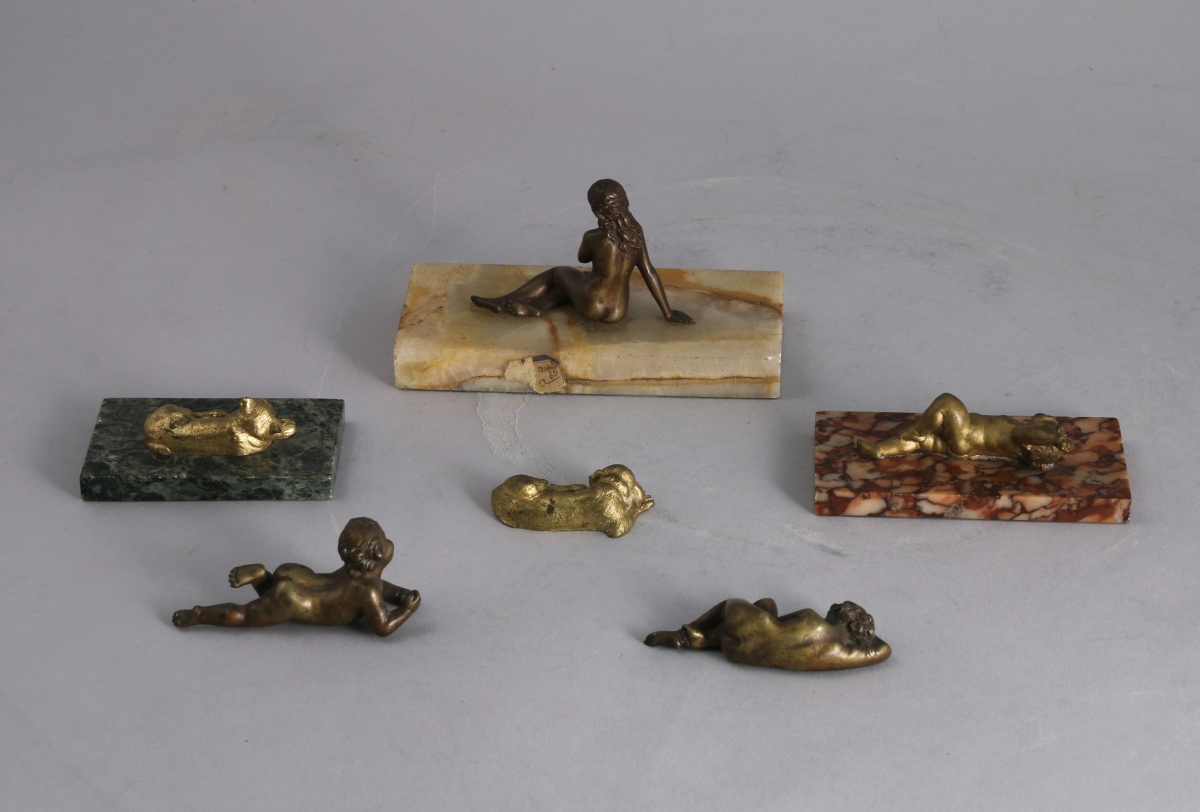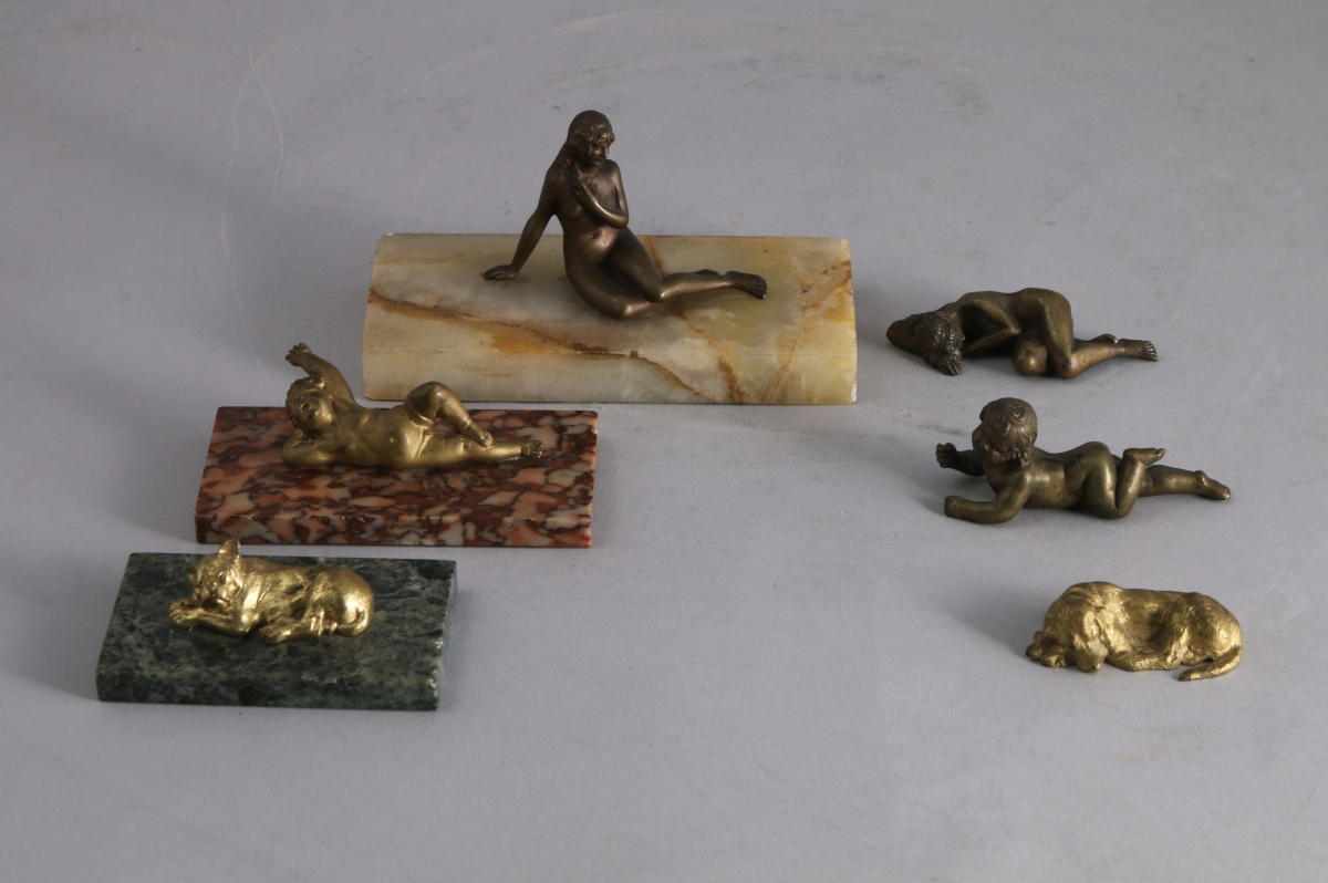 Réunion de 6 petits BRONZES de VIENNE, comprenant 2 FEMMES ALLONGÉES, 2 PUTTIS JOUEURS et 2 CHIENS.