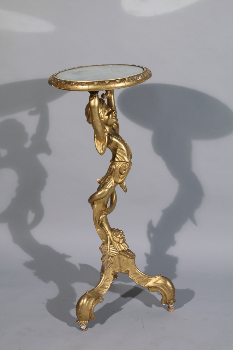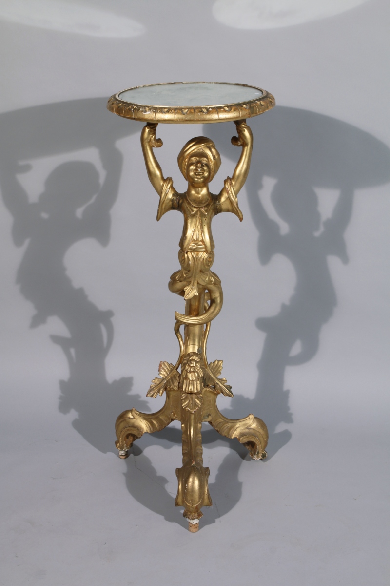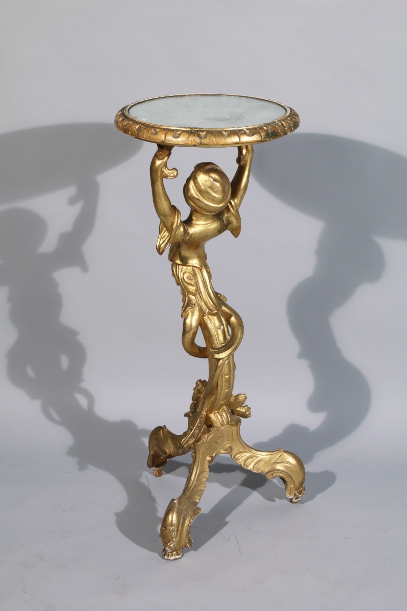 SELLETTE en bois sculpté et doré. Le plateau circulaire foncé d'un miroir, soutenu par un génie phytomorphe. Elle repose sur trois pieds cambrés et feuillagés.