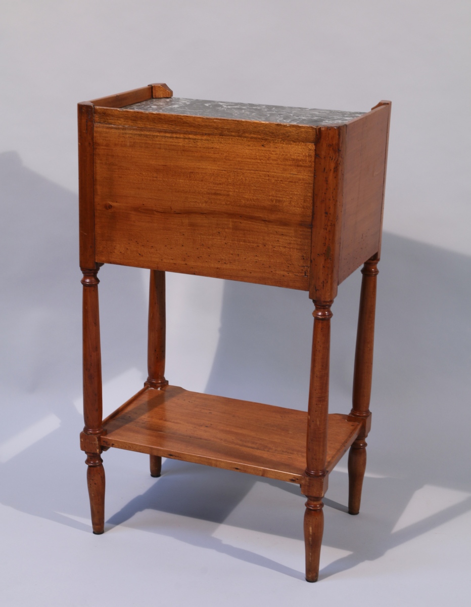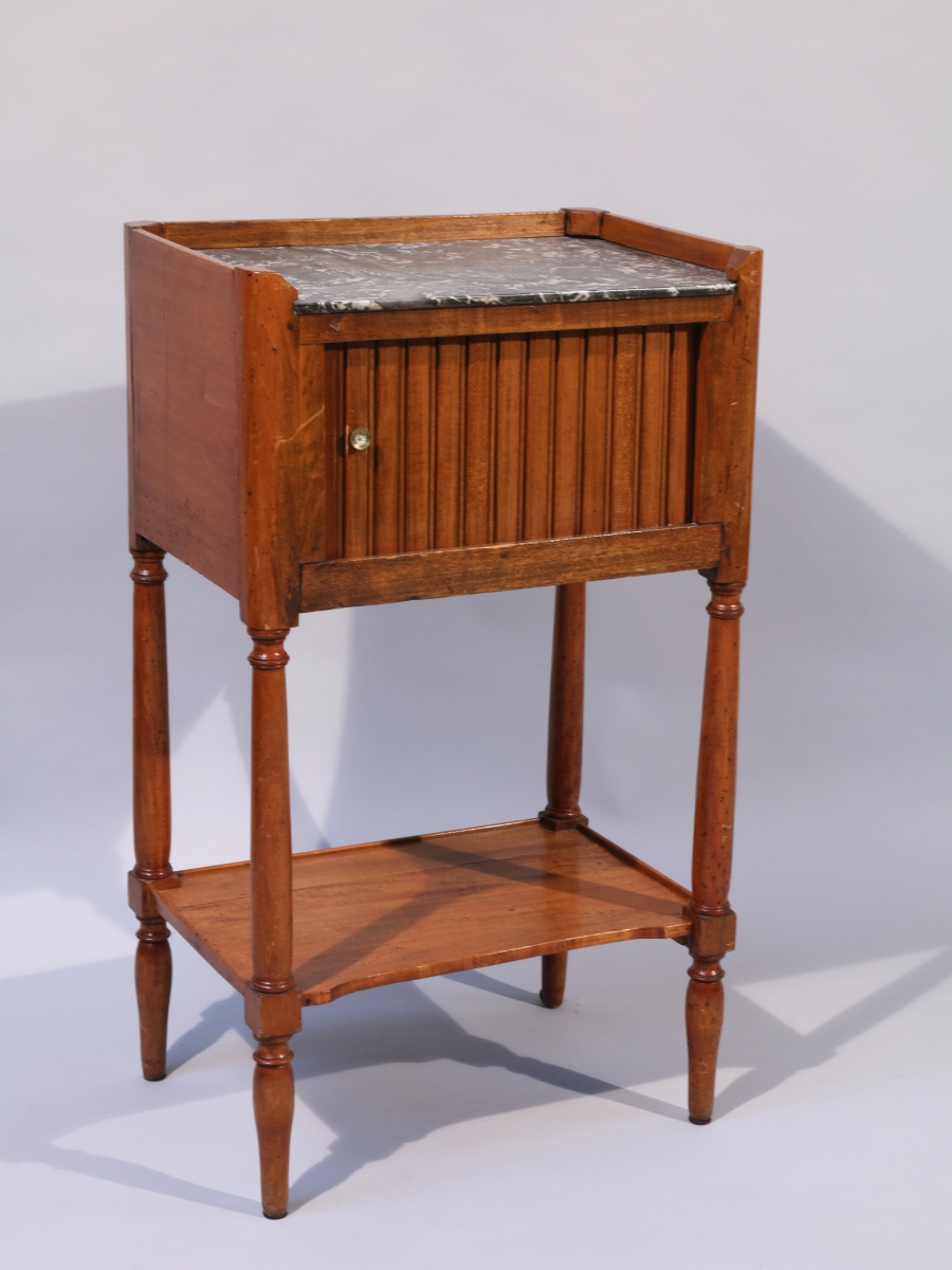 CHEVET de forme rectangulaire en noyer, ouvrant en façade par un volet à lattes. Il repose sur quatre pieds maintenus par une tablette d'entretoise. Dessus de marbre gris veiné blanc.