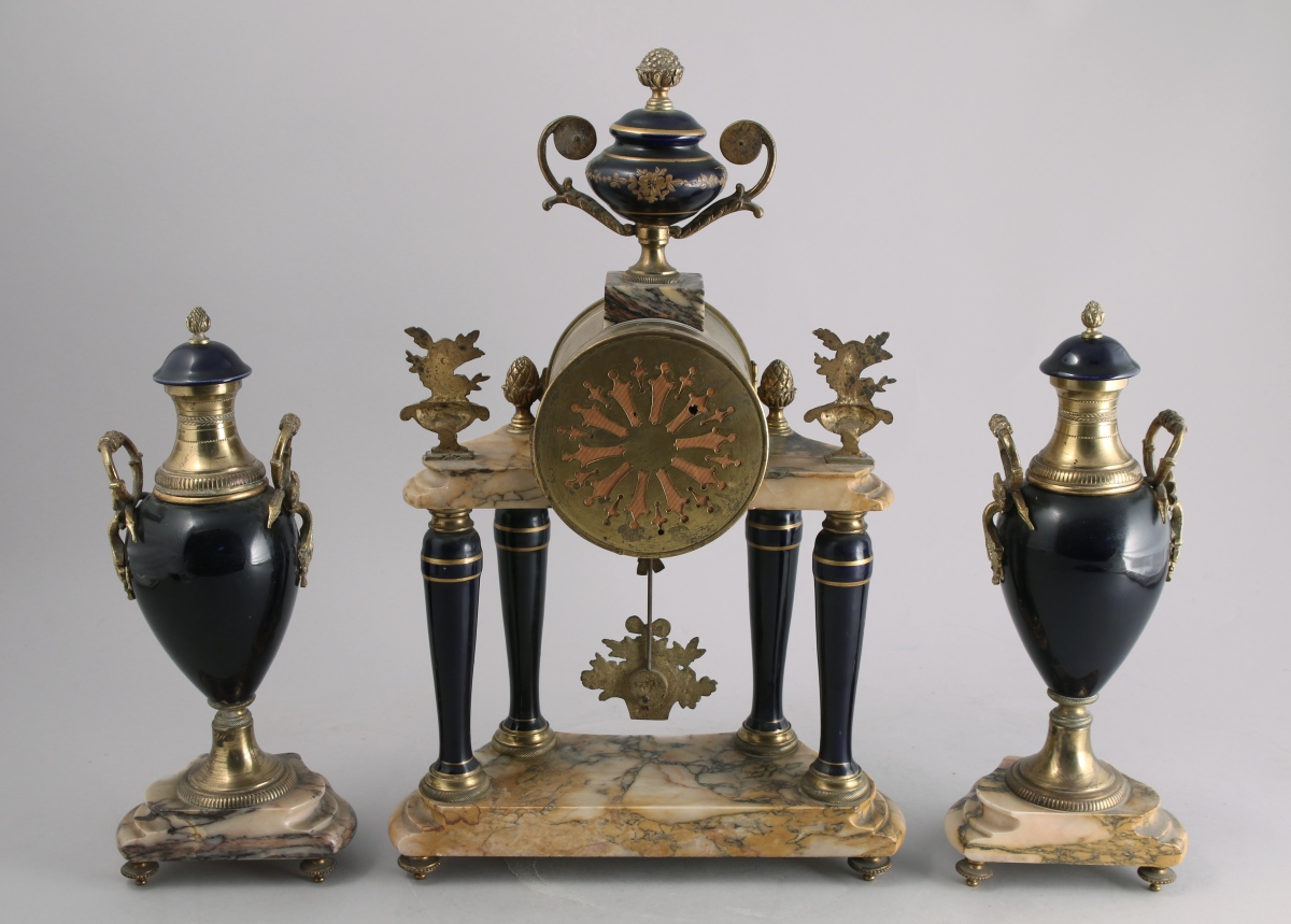 GARNITURE de CHEMINÉE en porcelaine émaillée bleu nuit à décor or et bronzes dorés. Elle se compose d'une pendule portique reposant sur quatre colonnes et de deux vases balustre. Bases en marbre de forme chantournée. Cadran signé A. CHEVA... (?) / ORLÉANS.