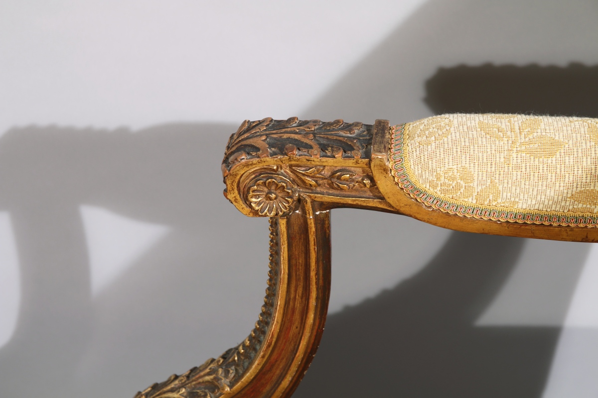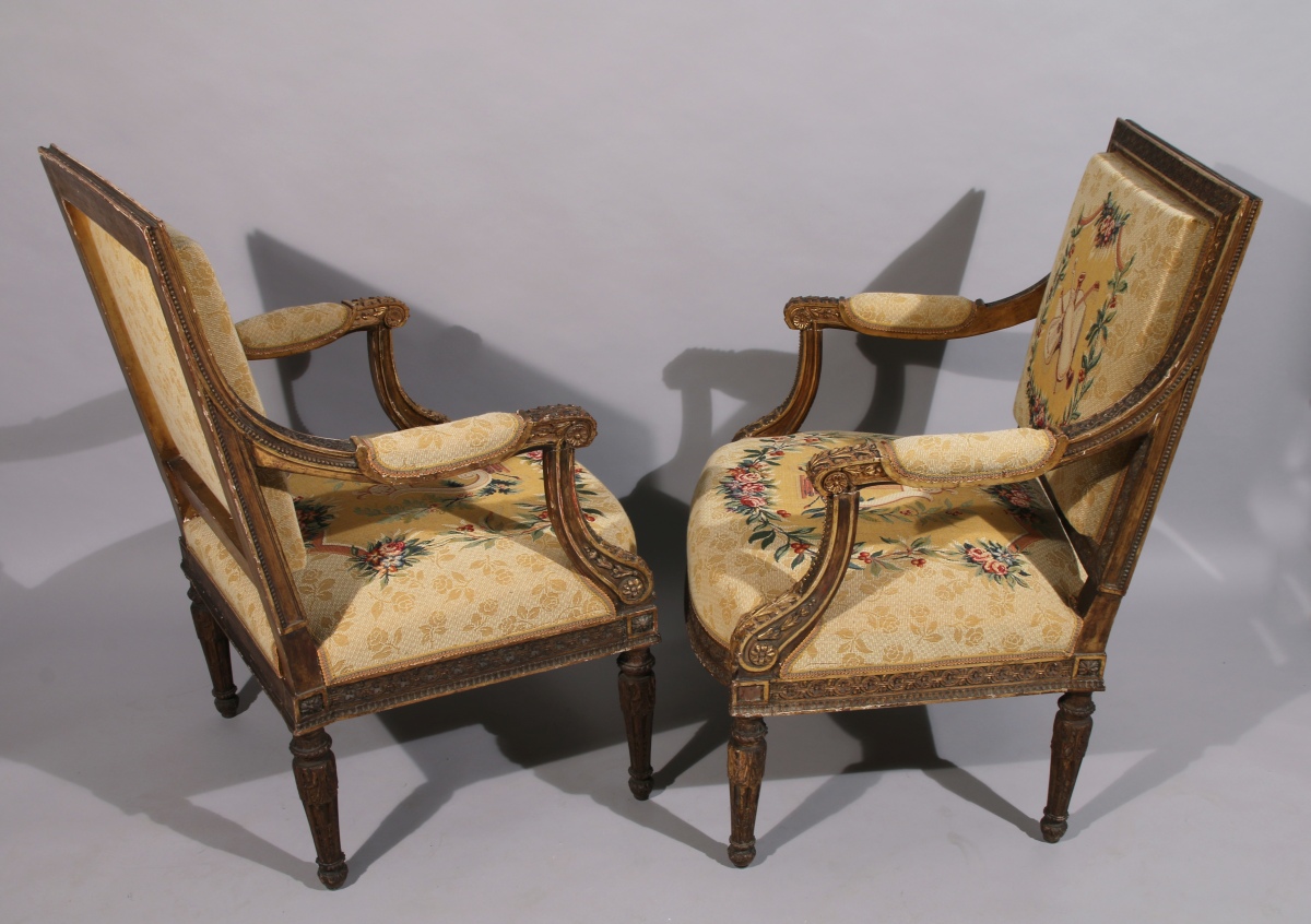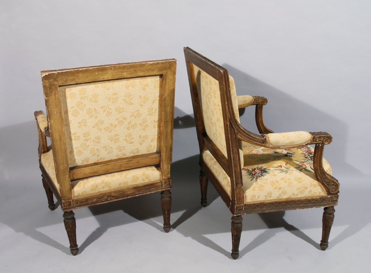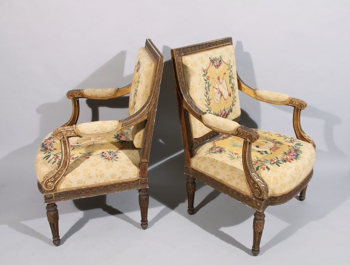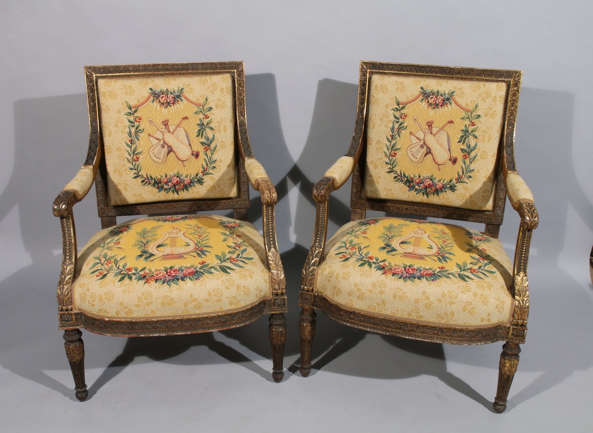 Paire de FAUTEUILS à la Reine en bois richement sculpté et doré de motifs néoclassique tels que enroulement de feuilles de laurier, rang de perles, feuilles d'oves. Les pieds fuselés, cannelés, rudentés. Garniture aux instruments de musique.