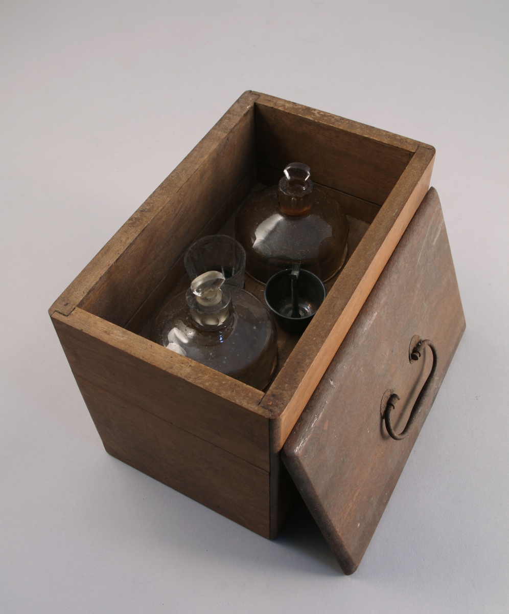 COFFRET à parfum en bois naturel. Paire de flacons en verre, petit verre à pans coupés, entonnoir argenté. Seconde moitié du XIXè.