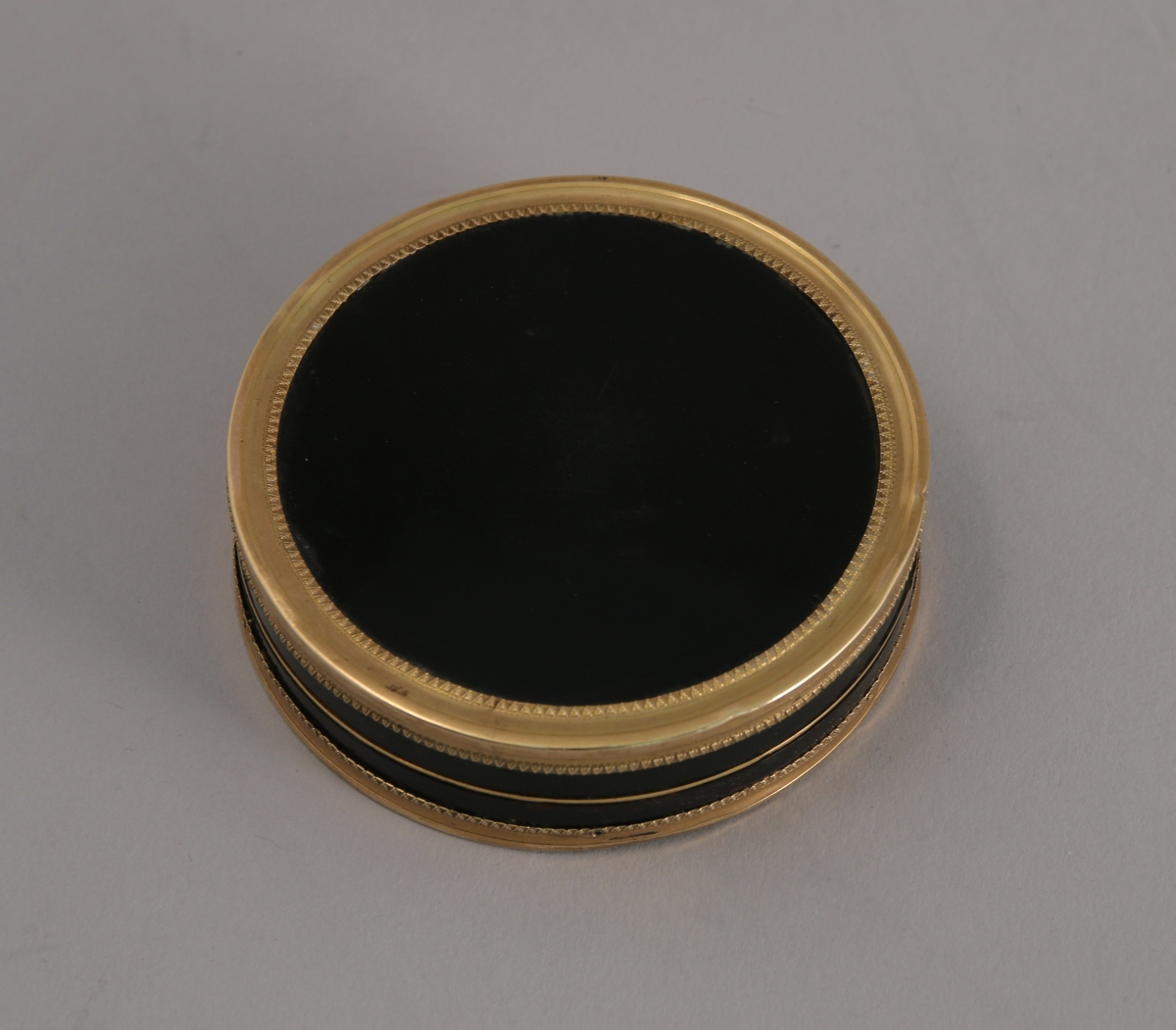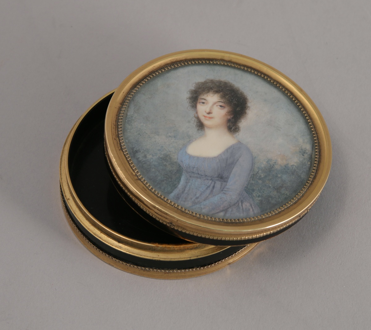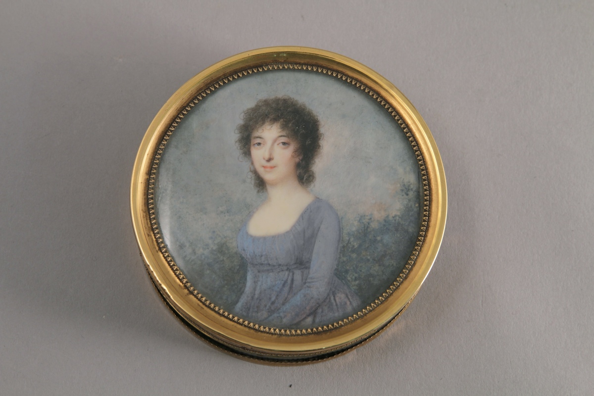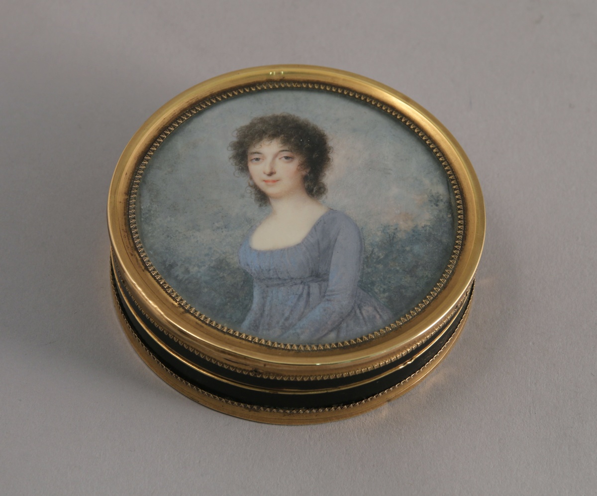 BOÎTE circulaire en écaille et cerclage or. Couvercle orné d'une miniature représentant un portrait trois quart de femme en cheveux.