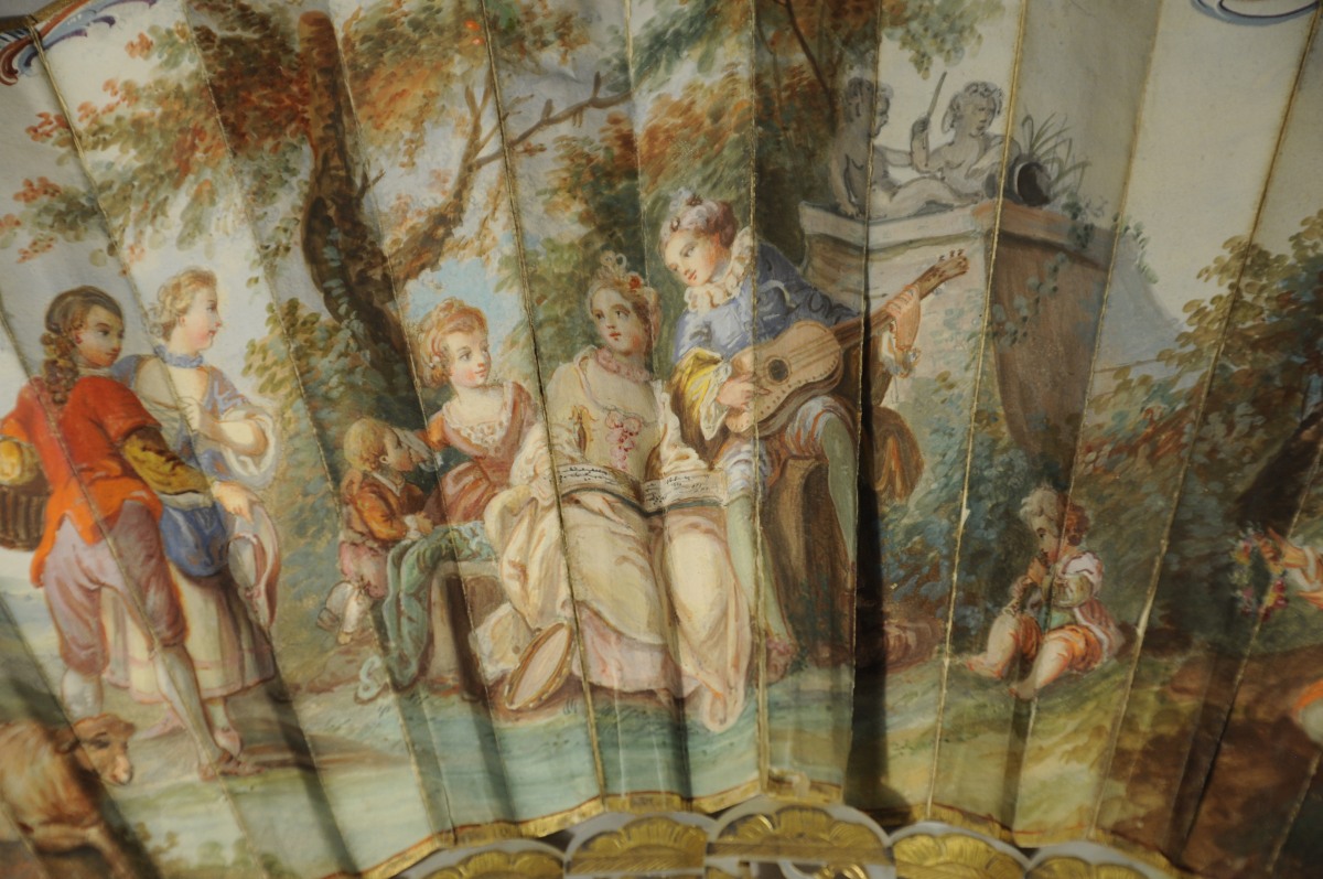 ÉVENTAIL plié. La feuille en papier marouflé sur parchemin peint à la gouache de scènes galantes près d'une rivière dans un entourage de fleurs et de rinceaux. Monture en nacre ajourée de personnages et rinceaux fleuris rehaussés or et argent.