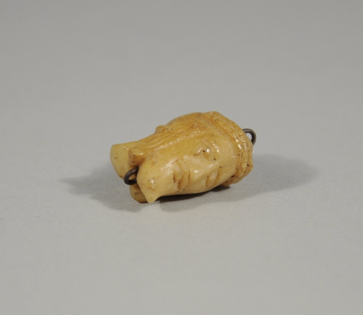 GRAIN TERMINAL DE CHAPELET MEMENTO MORI en os sculpté d'une part de la tête du Christ et d'autre part d'un crâne. Travail ancien.