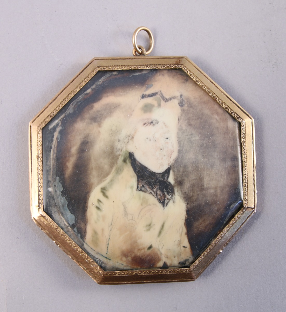 PRÉSENT D'AMITIÉ en médaillon de forme octogonale en or orné d'une frise ondée ciselée. Il présente, d'un côté, une miniature figurant un jeune homme en buste en habit à lavallière coiffé d'un bonnet de police, et de l'autre, le monogramme "JP"? et un noeud en cheveux entouré d'un semis de fleurs.